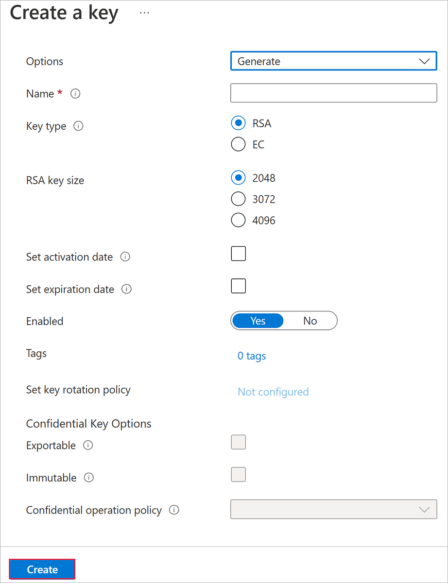 将“密钥类型”设置为“RSA”,将“RSA 密钥大小”设置为“2048” 。