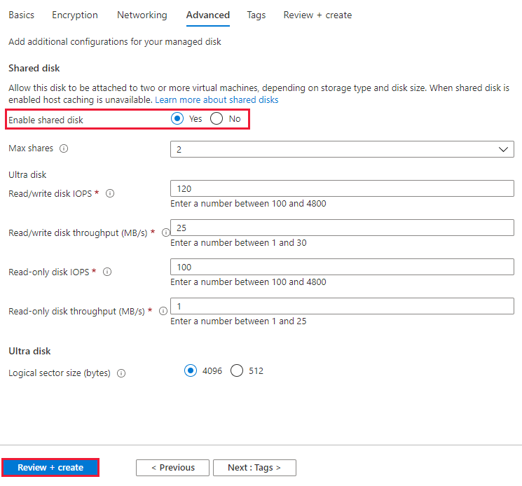 若要部署启用了共享磁盘功能的托管磁盘,请使用新属性 maxShares 并定义大于 1 的值。 这会使该磁盘可在多个 VM 之间共享。