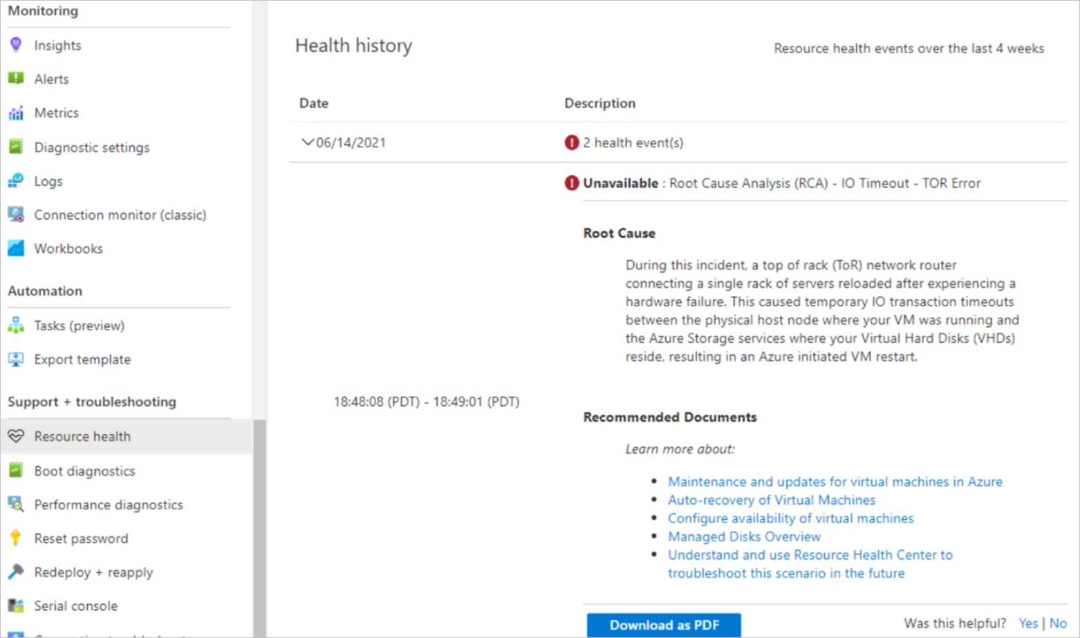我们最近对资源运行状况体验进行了改进,这将增强我们与客户共享的有关 VM 故障的信息,并提供有关导致问题的根本原因的进一步背景信息。 现在,除了在 VM 的可用性受到影响时获得快速通知之外,客户可能还希望我们在稍后(此时我们的自动化根本原因分析 (RCA) 系统已识别出导致 VM 故障的 Azure 平台故障组件)添加根本原因。 让我们通过一个例子来看看这个过程在实践中是如何工作的: