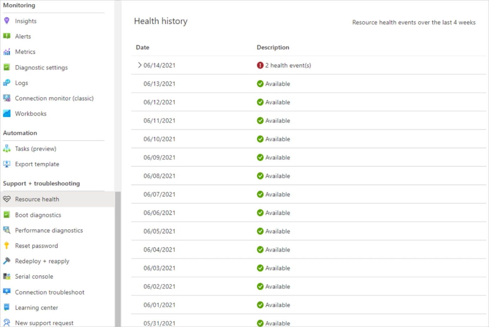 它通过门户为各个资源提供即时的且用户友好的运行状况检查。 客户可以快速访问门户上的资源运行状况边栏选项卡,还可以查看 30 天的运行状况检查历史记录,这使其成为一个可以快速且直接地进行故障排除的出色工具。 现有的 Azure 资源运行状况功能有助于你诊断影响 Azure 资源的服务问题并获得相应的支持。 它会报告资源当前的和过去的运行状况,显示每个资源都不可用的任何时间范围。