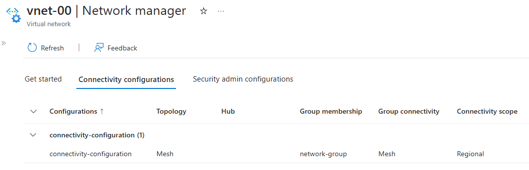在本快速入门中,部署三个虚拟网络,并使用 Azure Virtual Network Manager 创建网格网络拓扑。 然后验证是否应用了连接配置。