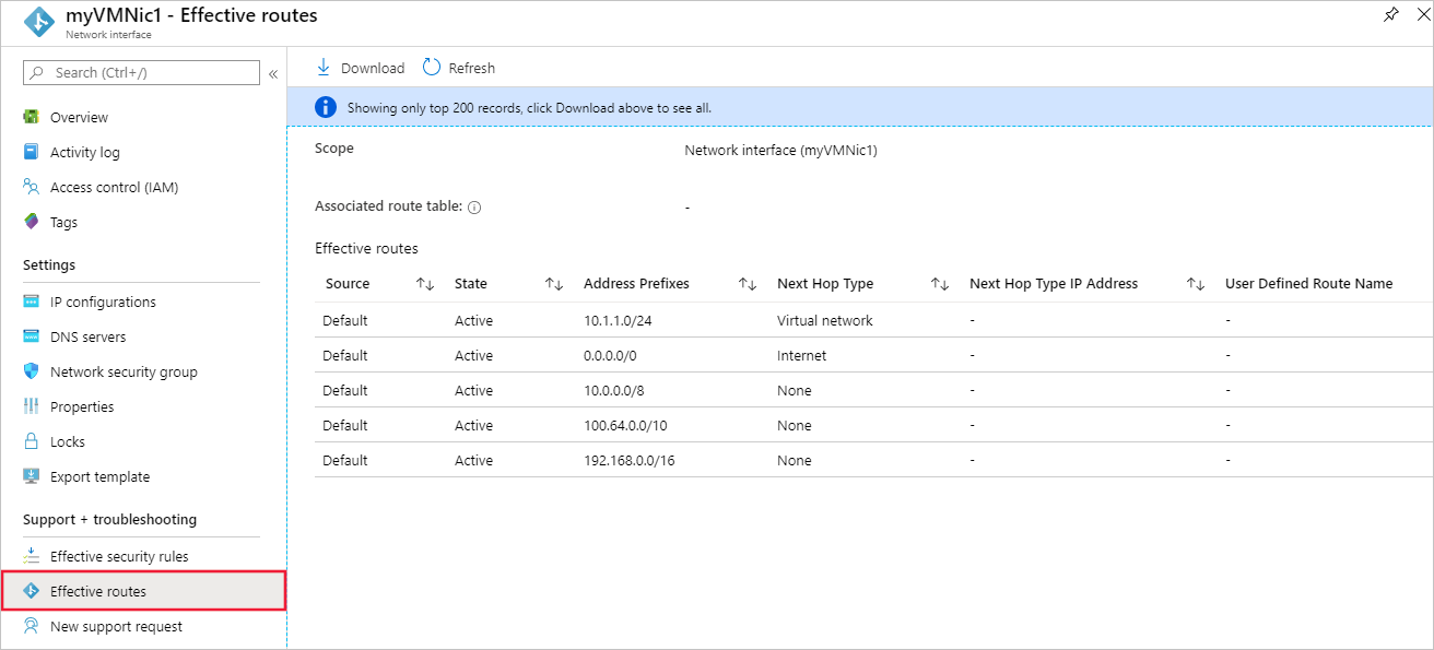 选择所需的网络接口以查看其有效路由。 每个接口可能属于不同的子网,从而导致唯一路由。 该图像中的示例显示 Azure 为每个子网创建的默认路由。 你的列表包括默认路由,也可能包括额外的路由。 路由可能来自虚拟网络对等互连或通过 Azure VPN 网关连接到本地网络等功能。 有关路由的详细信息,请参阅 虚拟网络流量路由。 如果有许多路由,请使用 “下载 ”选项将它们另存为 .csv 文件,以便更轻松地查看。