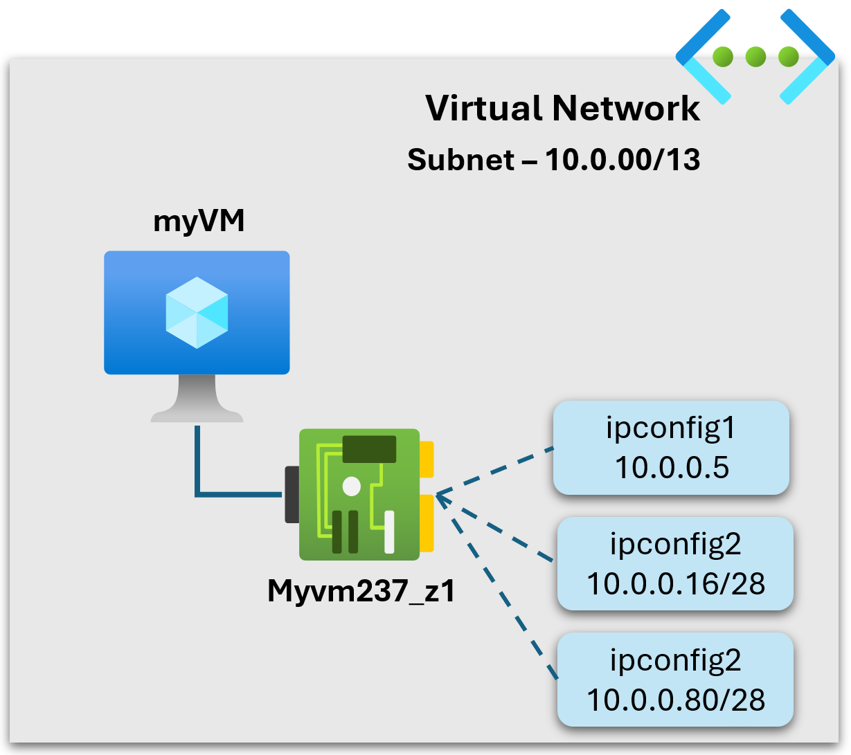 可以从可用 IP 地址范围静态或动态地分配所有 IP 地址。 有关详细信息,请参阅 Azure 中的 IP 地址。 单个 NIC 上的所有 IP 配置都必须关联到同一子网。 如果需要不同子网上的多个 IP,可以使用 VM 上的多个 NIC。 有关详细信息,请参阅使用多个 NIC 创建 VM。