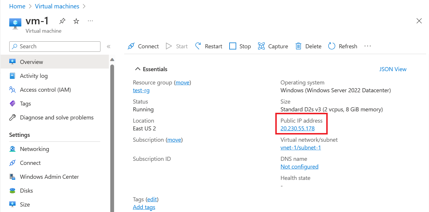 在 vm-mgmt 的“概述”页上,记下 VM 的公共 IP 地址。