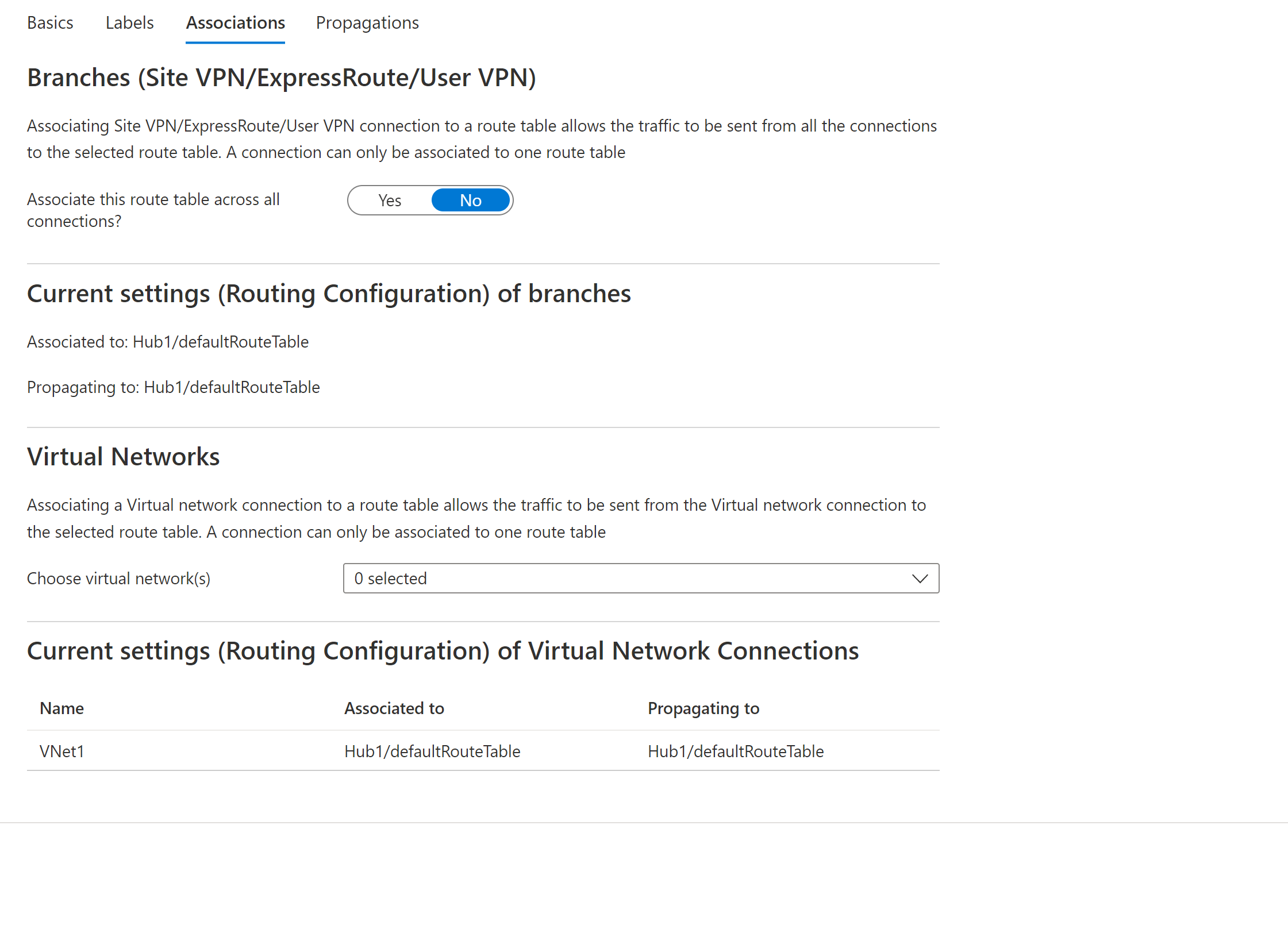 在“关联”页面上,将连接关联到路由表。 你将看到连接的“分支”、“虚拟网络”和“当前设置”。 配置设置后,移动到“传播”页面。