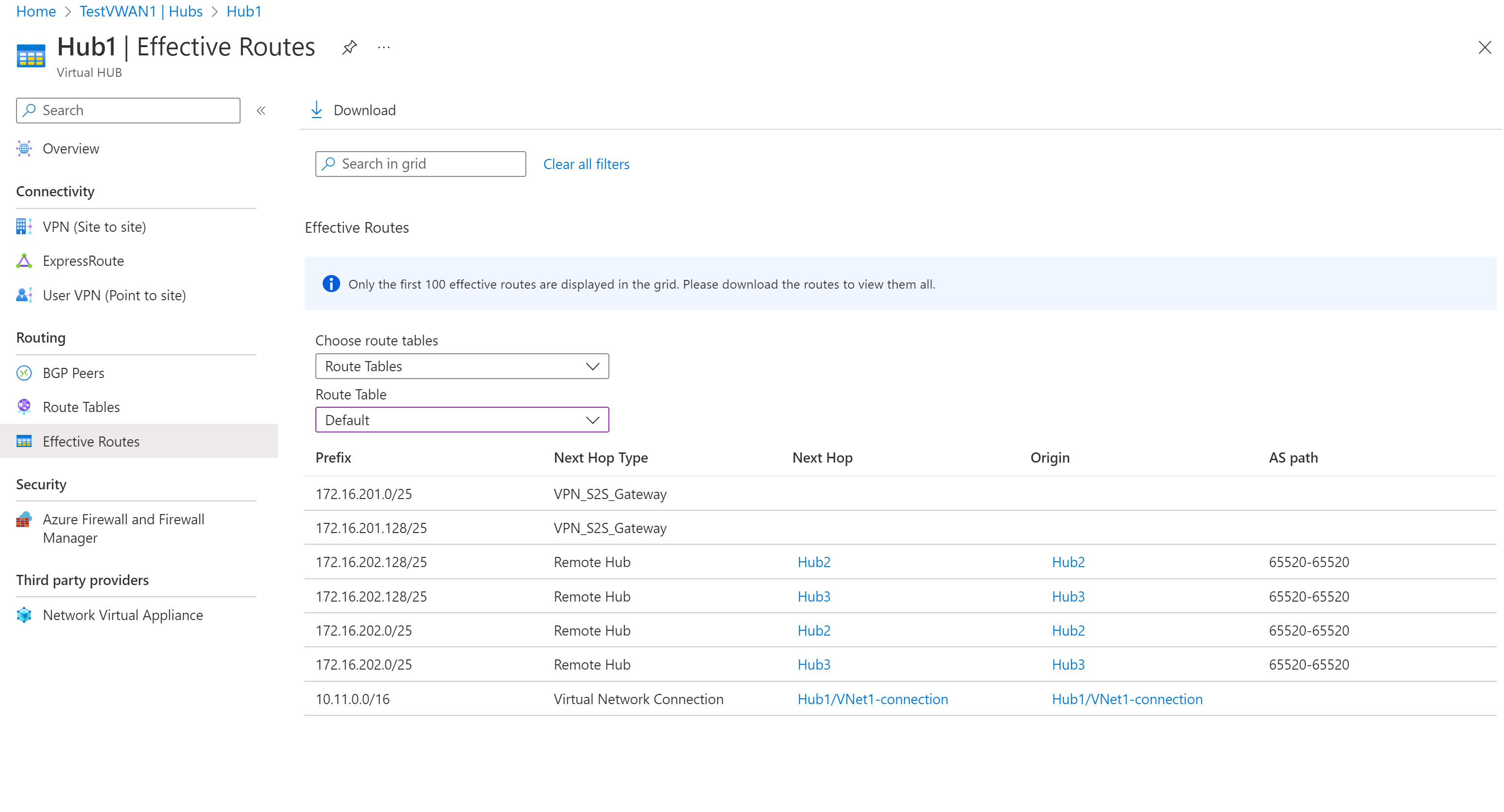 在 Azure 门户中,转到“虚拟中心”->“有效路由”页面。