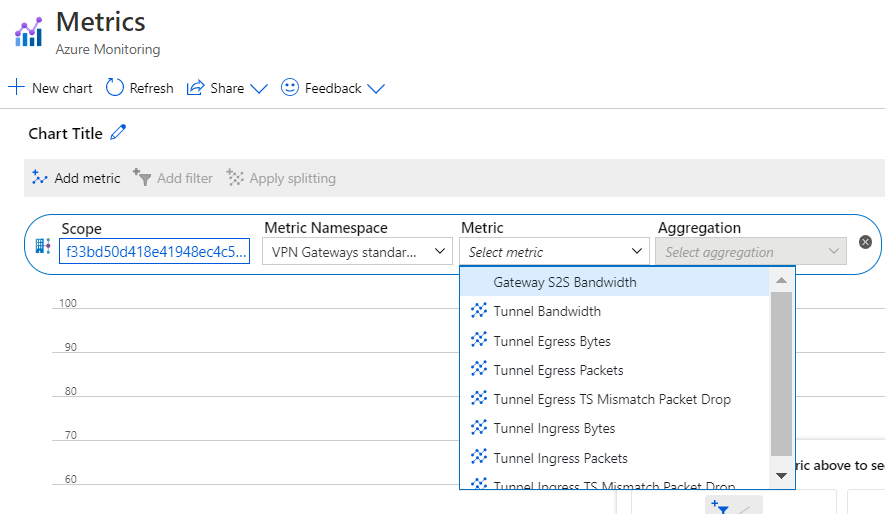 - 总和聚合类型。 此总和聚合类型显示所选时间段内遍历虚拟中心路由器的字节总数。 例如,如果时间粒度设置为 5 分钟,则每个数据点将对应于 5 分钟时间间隔内发送的字节数。 若要将此值转换为 Gbps,可以将此数字除以 37500000000。 根据虚拟中心的容量,中心路由器可支持 3 Gbps 至 50 Gbps。 此时“最大值”和“最小值”聚合类型没有意义。