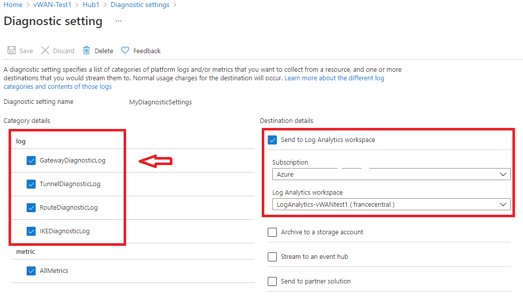 在此页中,可以创建新的诊断设置(“+ 添加诊断设置”)或编辑现有诊断设置(“编辑设置”)。 可以选择将诊断日志发送到 Log Analytics(如以下示例所示)、流式传输到事件中心、发送到第 3 方解决方案或存档到存储帐户。