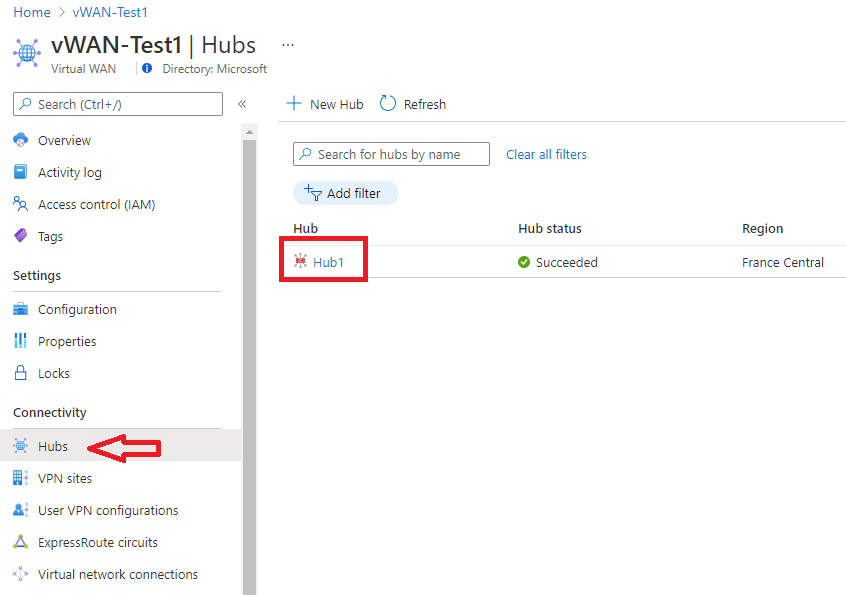 在门户中,导航到虚拟 WAN 资源,然后在“连接”组中选择“中心”。