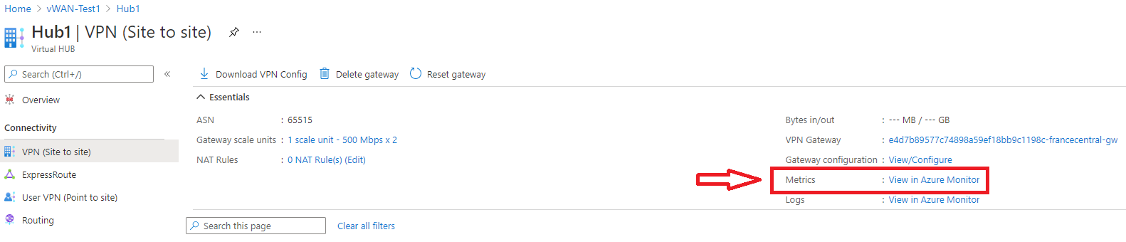 若要查看虚拟中心路由器的指标,可以从虚拟中心“概述”页中选择“指标”。
