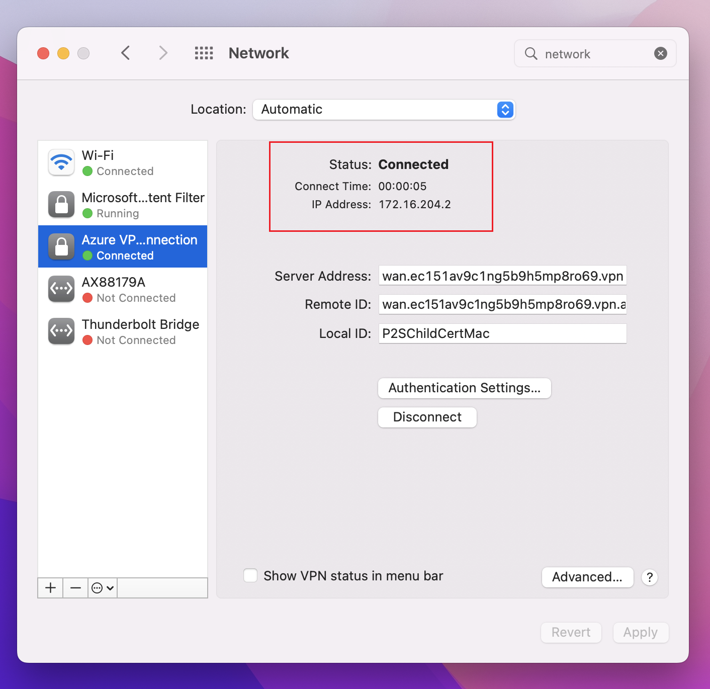 - VpnServerRoot.cer:包含在 P2S 连接设置过程中验证 Azure VPN 网关所需的根证书。