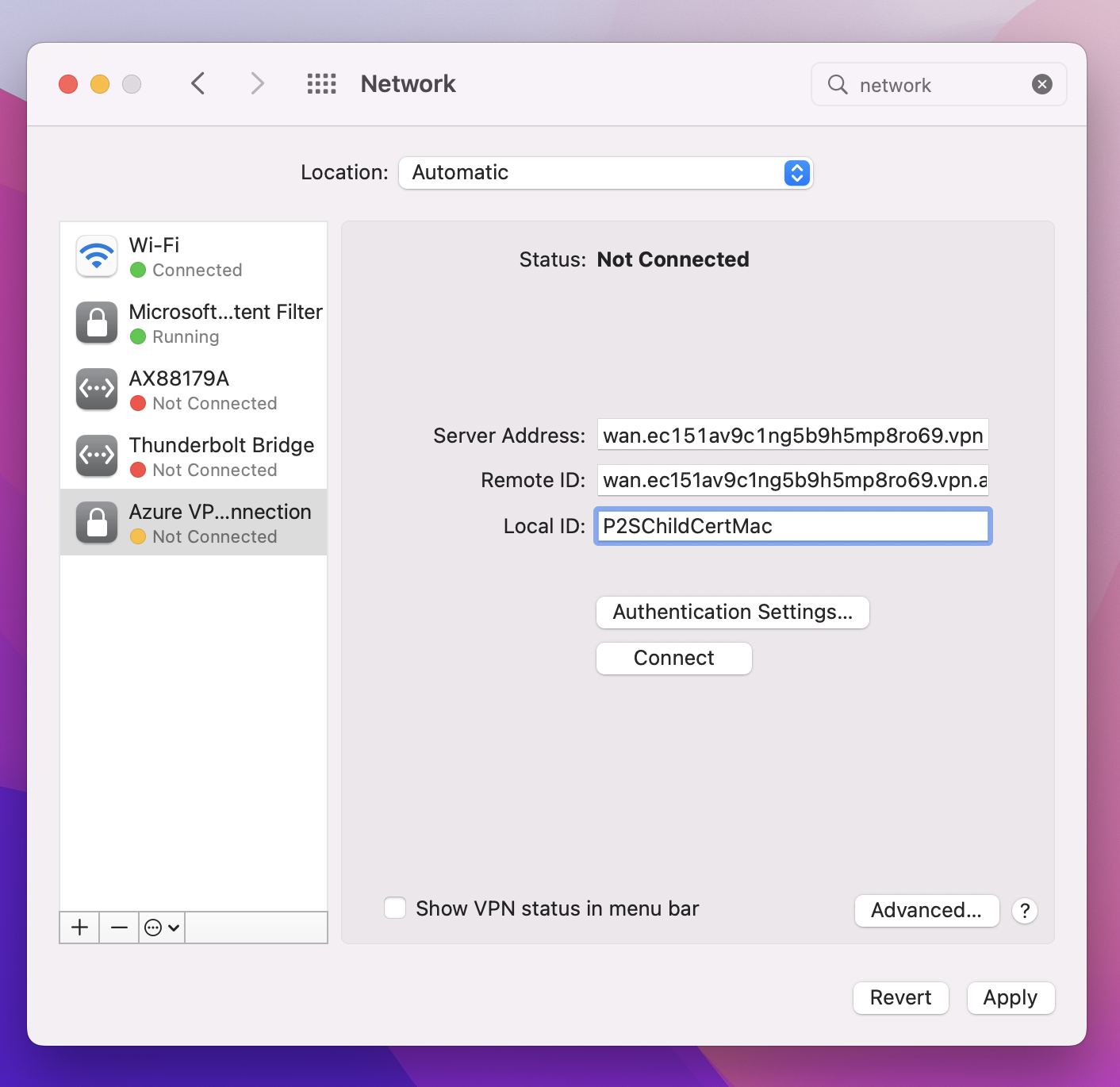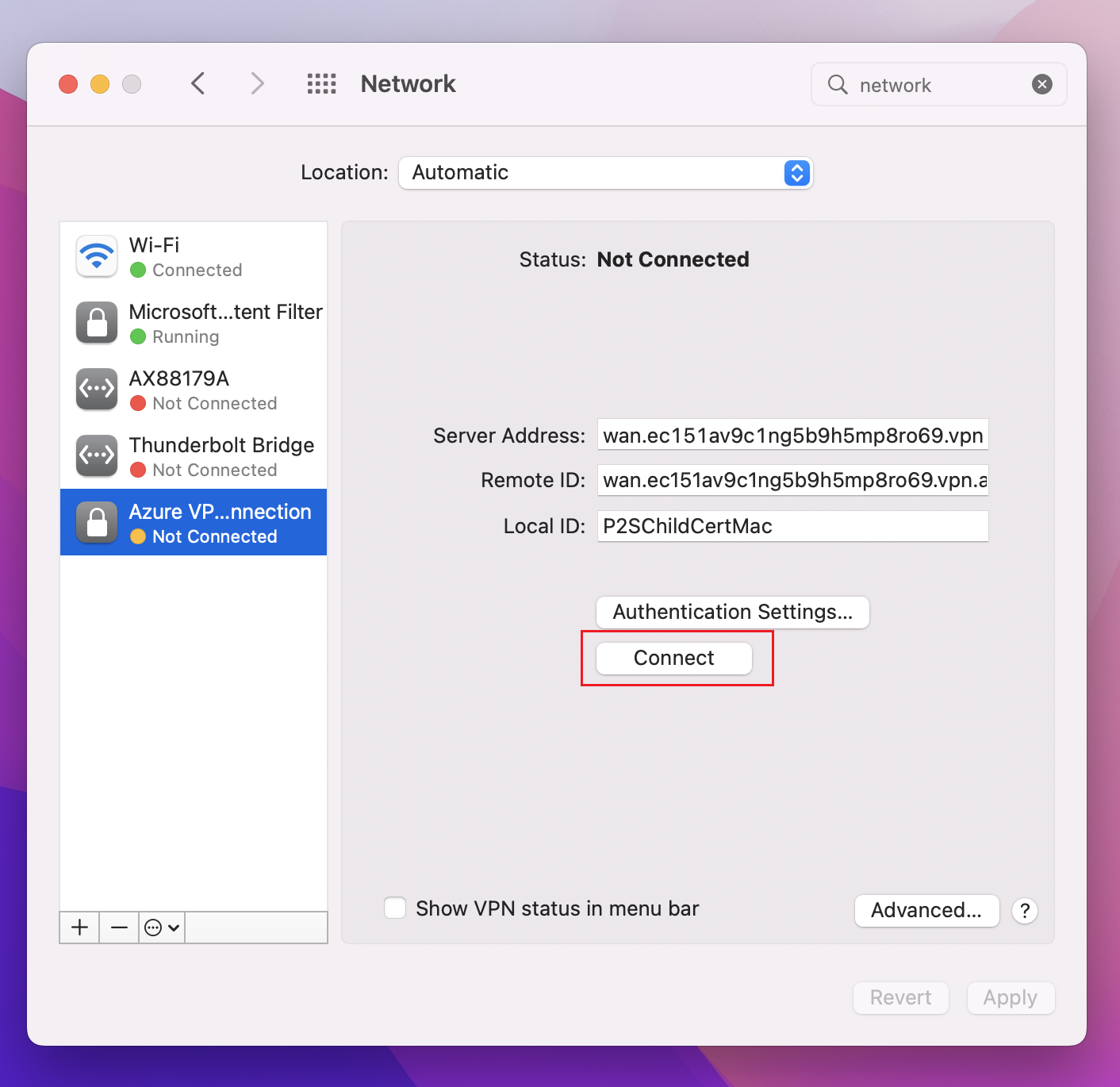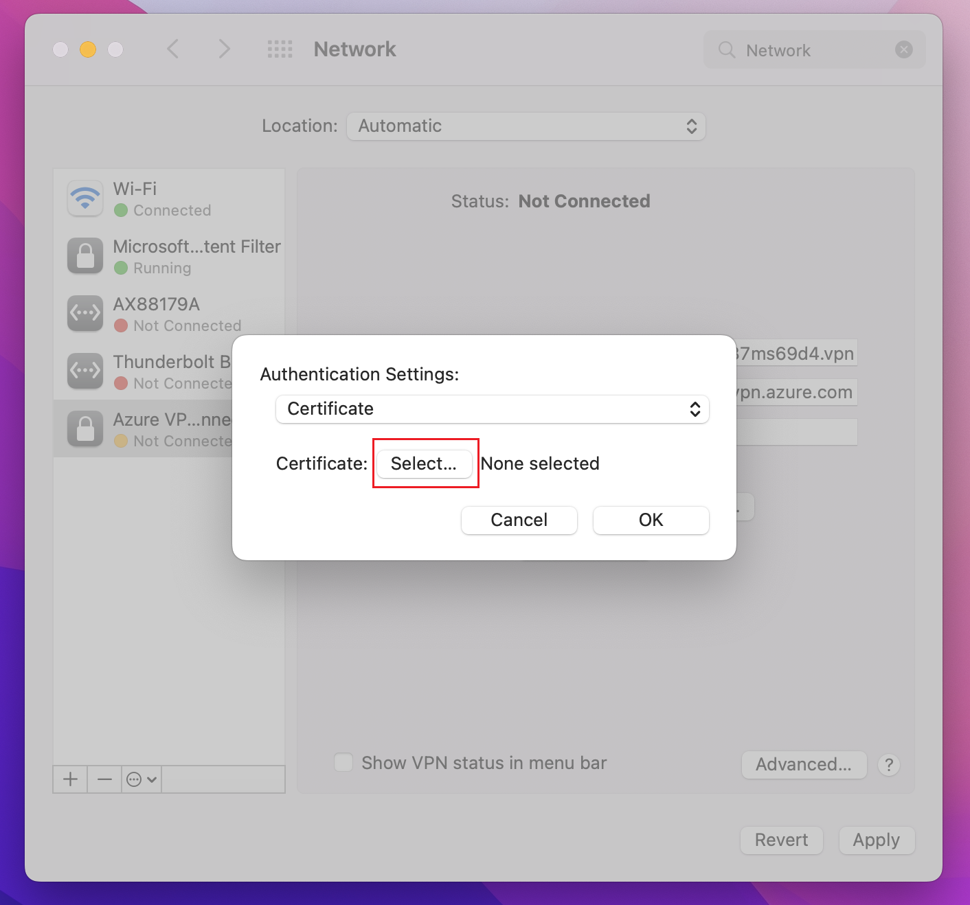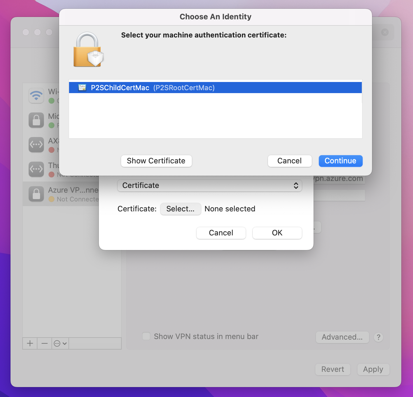 使用以下步骤在 Mac 中配置用于证书身份验证的本机 VPN 客户端。 必须在要连接到 Azure 的每一台 Mac 上完成这些步骤。