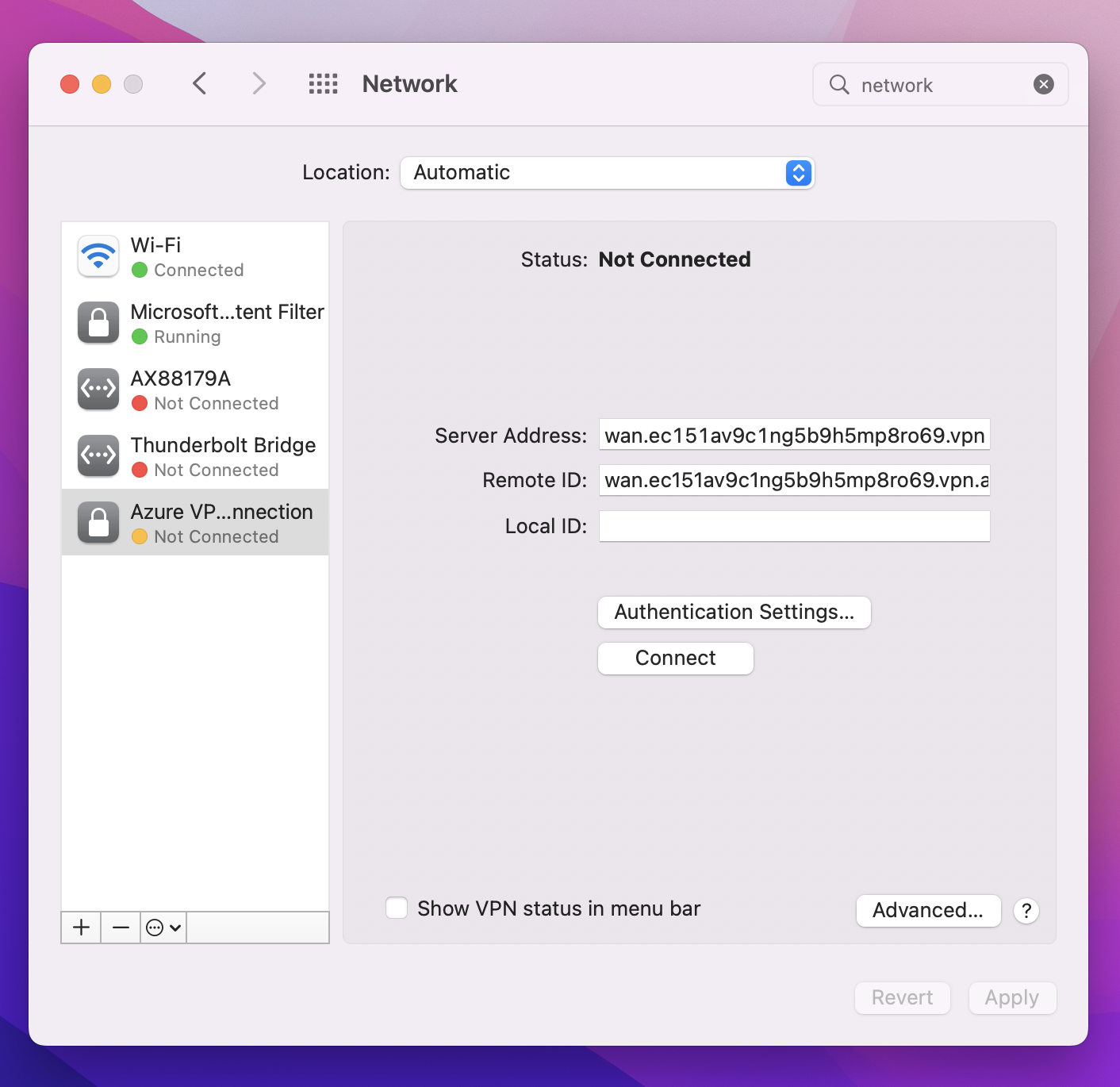 将 VpnServer 标记值粘贴到配置文件的“服务器地址”和“远程 ID”字段中 。 将“本地 ID”保留为空。 然后单击“身份验证设置…”。