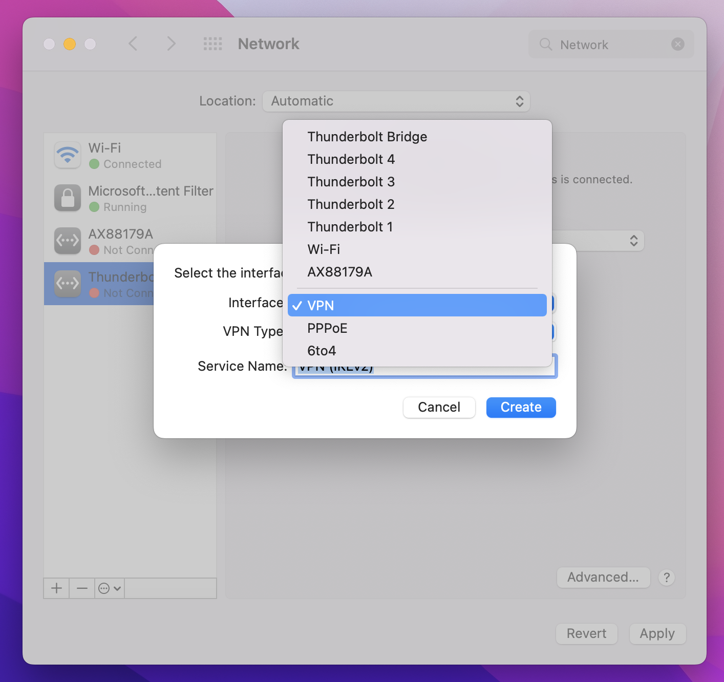 对于“VPN 类型”,从下拉列表中选择 IKEv2。 在“服务名称”字段中,为配置文件指定易记名称,然后单击“创建”。