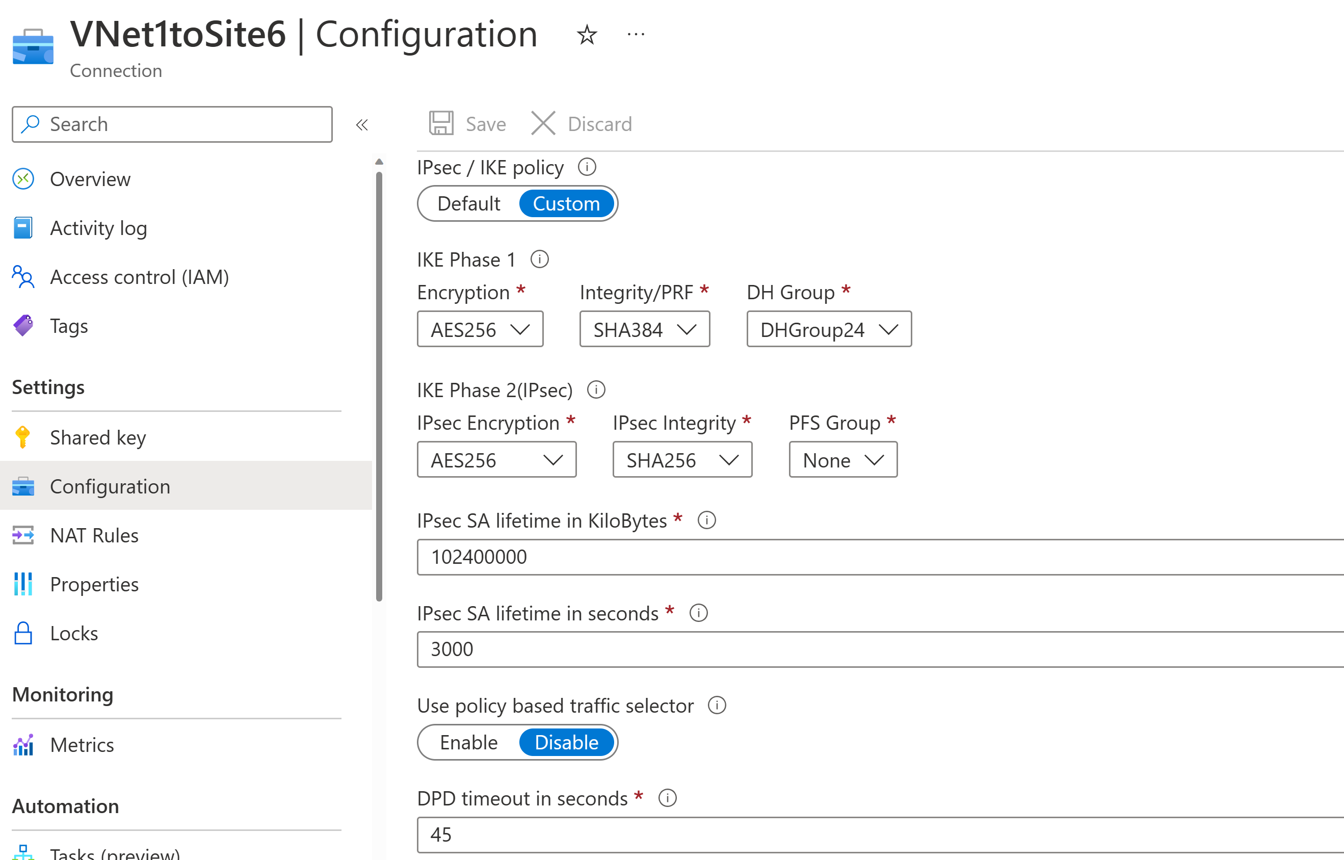 转到创建的“连接”资源 VNet1toSite6。 打开“配置”页面。 选择“自定义”IPsec/IKE 策略以显示所有配置选项。 以下屏幕截图根据列表显示配置:
