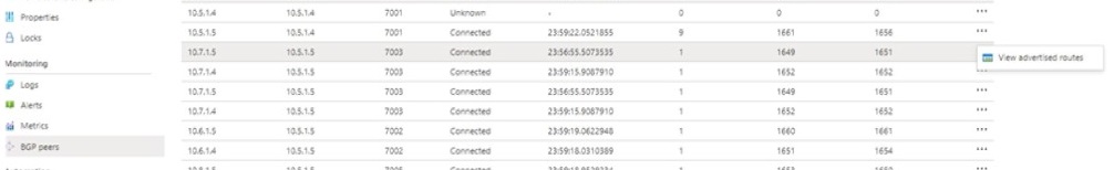 在 Azure 门户中,可以查看 BGP 对等方、已获知的路由和已播发的路由。 还可以下载包含此数据的 .csv 文件。