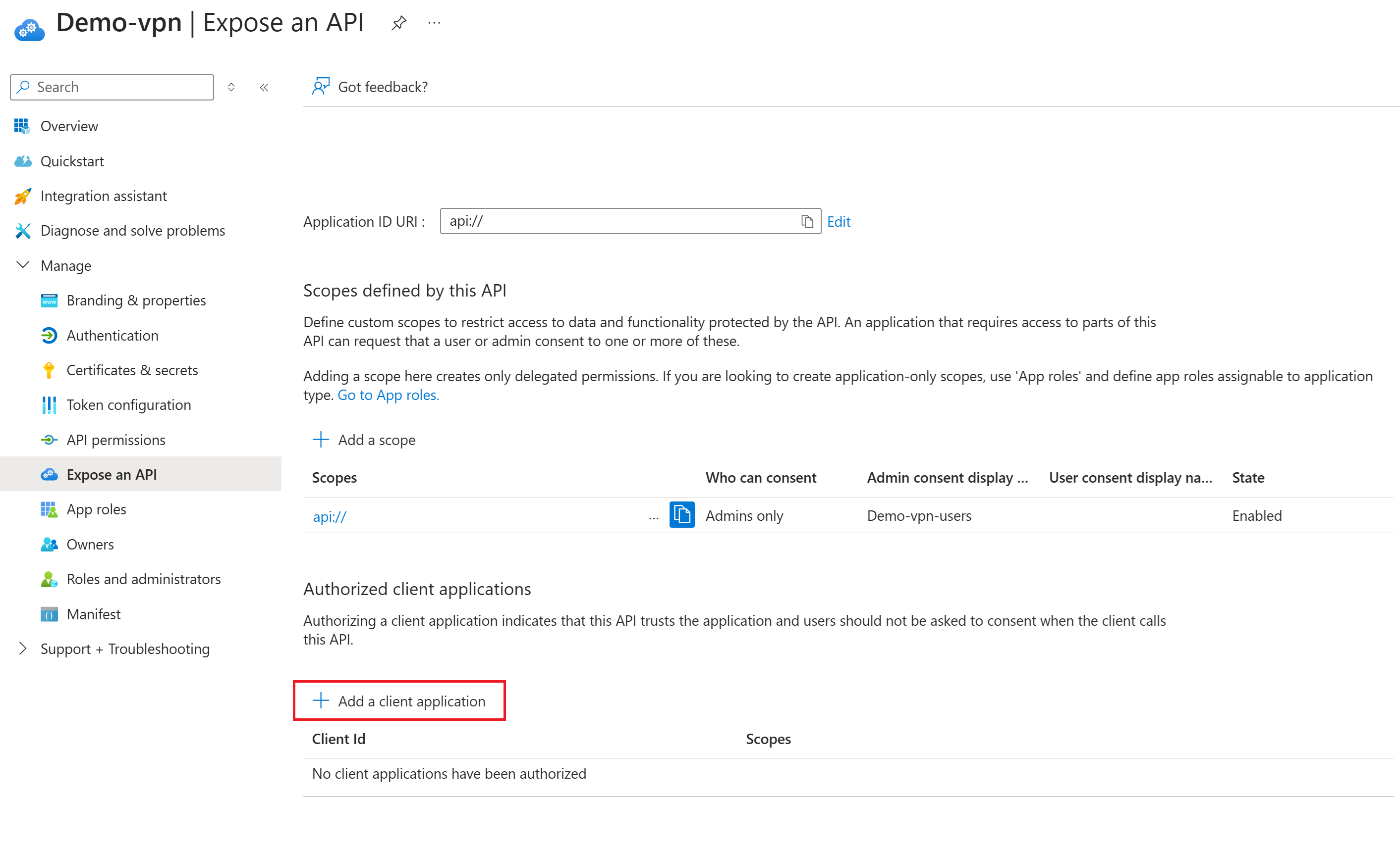 在以下步骤中,使用Microsoft注册的 Azure VPN 客户端应用 ID 受众值添加另一个授权客户端应用程序。 不会更改现有授权客户端应用程序的值。 如果不再使用它,始终可以删除现有的授权客户端应用程序。