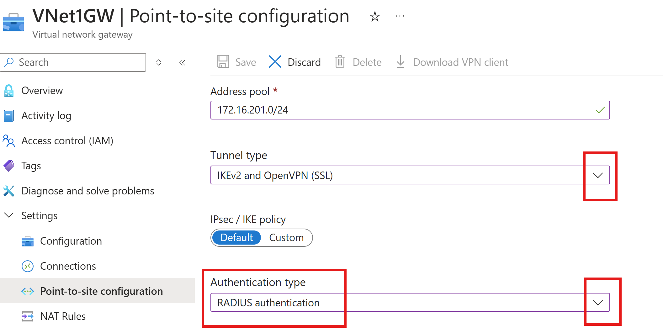 如果在“点到站点配置”页面上未显示隧道类型或身份验证类型,则表示网关使用的是 Basic SKU。 基本 SKU 不支持 IKEv2 或 RADIUS 身份验证。 若要使用这些设置,需要删除网关,然后使用另一网关 SKU 重新创建网关。