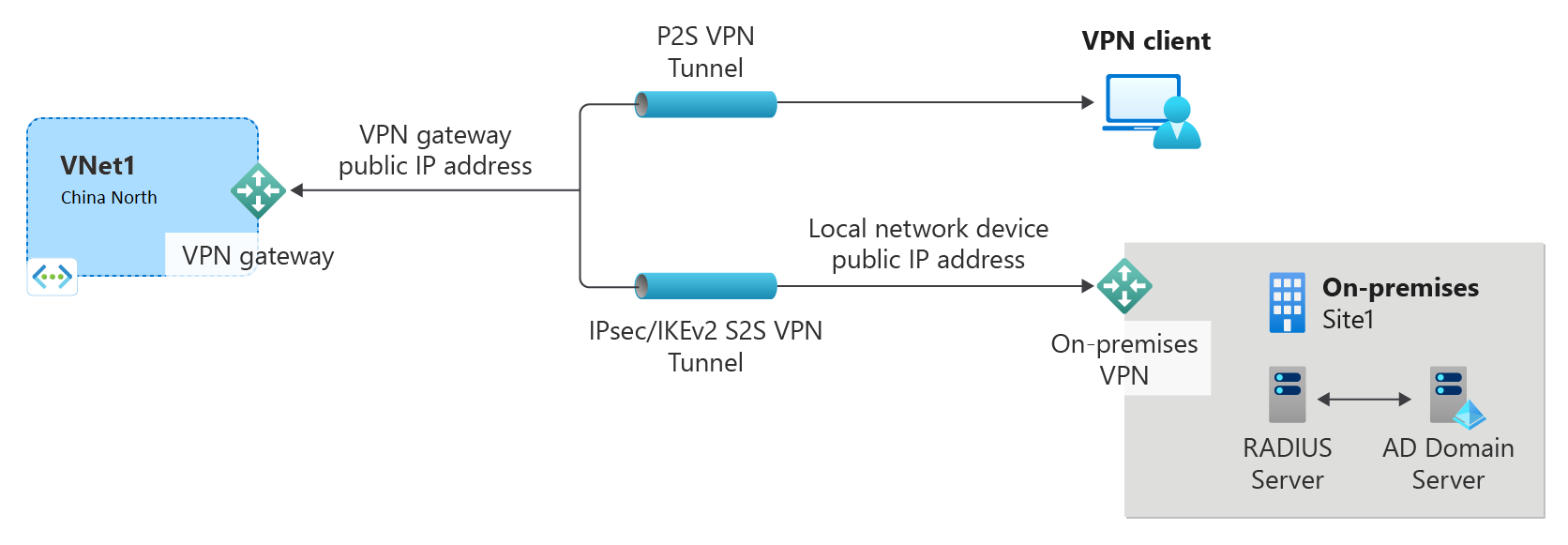 - 用于处理用户身份验证的 RADIUS 服务器。 可将 RADIUS 服务器部署在本地或 Azure 虚拟网络 (VNet) 中。 还可以配置两个 RADIUS 服务器以实现高可用性。