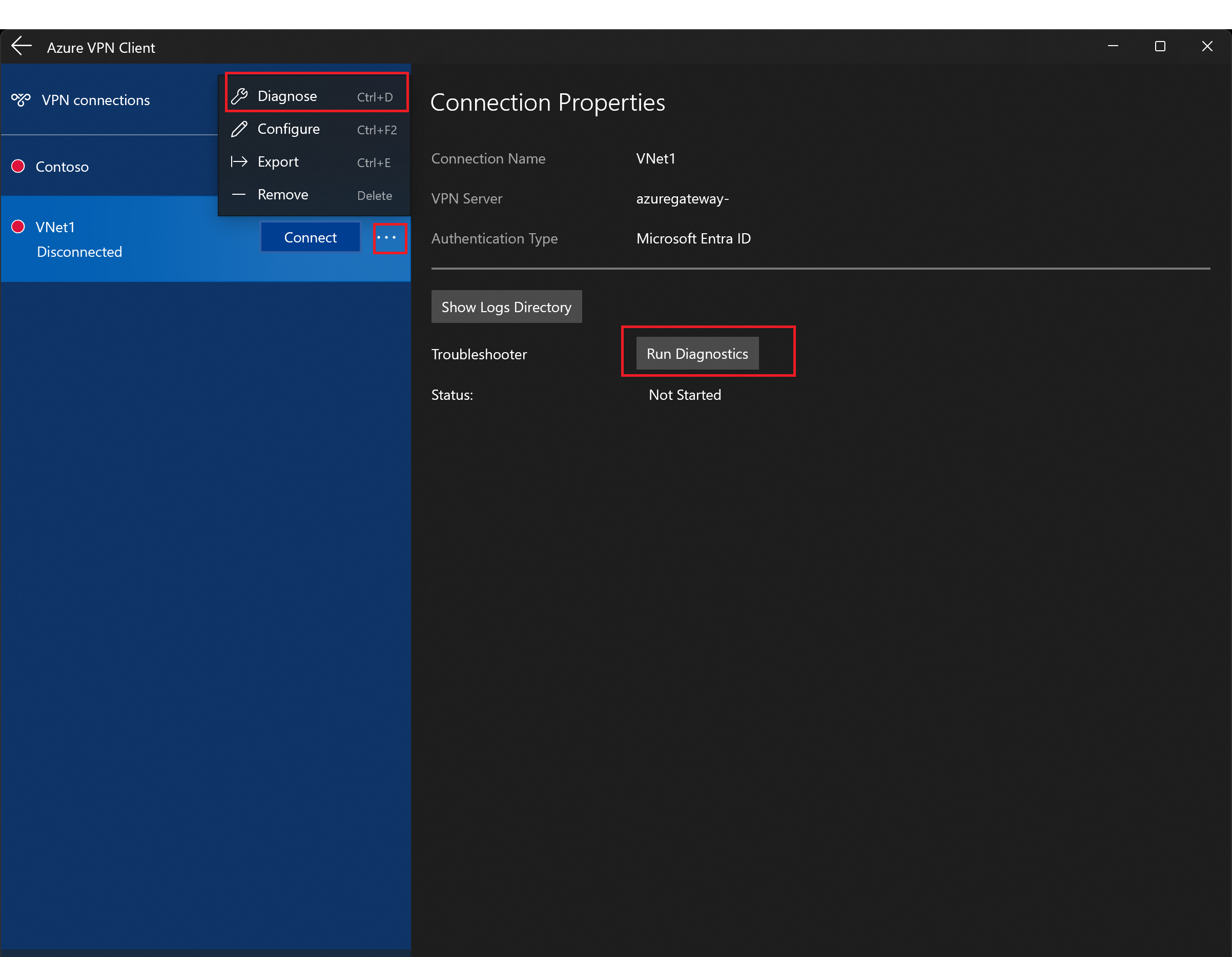 如果遇到连接问题,如果运行的是 v4.0.0.0 版的 Azure VPN 客户端或更高版本,则可以单击 Azure VPN 客户端页面底部的 ... ,然后选择 “先决条件”。 在“测试应用程序先决条件”页面上,选择“运行先决条件测试”。 解决出现的任何问题,然后再次尝试连接。 有关详细信息,请参阅 Azure VPN 客户端先决条件检查。