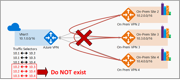 如图所示,针对每个本地网络前缀,Azure VPN 网关都有来自虚拟网络的流量选择器,而交叉连接前缀却没有。 例如,本地站点 2、站点 3 和站点 4 可以分别与 VNet1 通信,但不能经由 Azure VPN 网关相互连接。 该图显示若采用此配置,交叉连接流量选择器在 Azure VPN 网关中不可用。