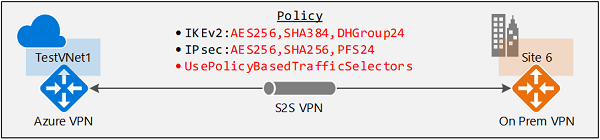 $ipsecpolicy6 = New-AzIpsecPolicy -IkeEncryption AES256 -IkeIntegrity SHA384 -DhGroup DHGroup24 -IpsecEncryption AES256 -IpsecIntegrity SHA256 -PfsGroup None -SALifeTimeSeconds 14400 -SADataSizeKilobytes 102400000使用基于策略的流量选择器和 IPsec/IKE 策略创建 S2S VPN 连接,并应用在上一步创建的 IPsec/IKE 策略。 请注意其他参数“-UsePolicyBasedTrafficSelectors $True”可对连接启用基于策略的流量选择器。