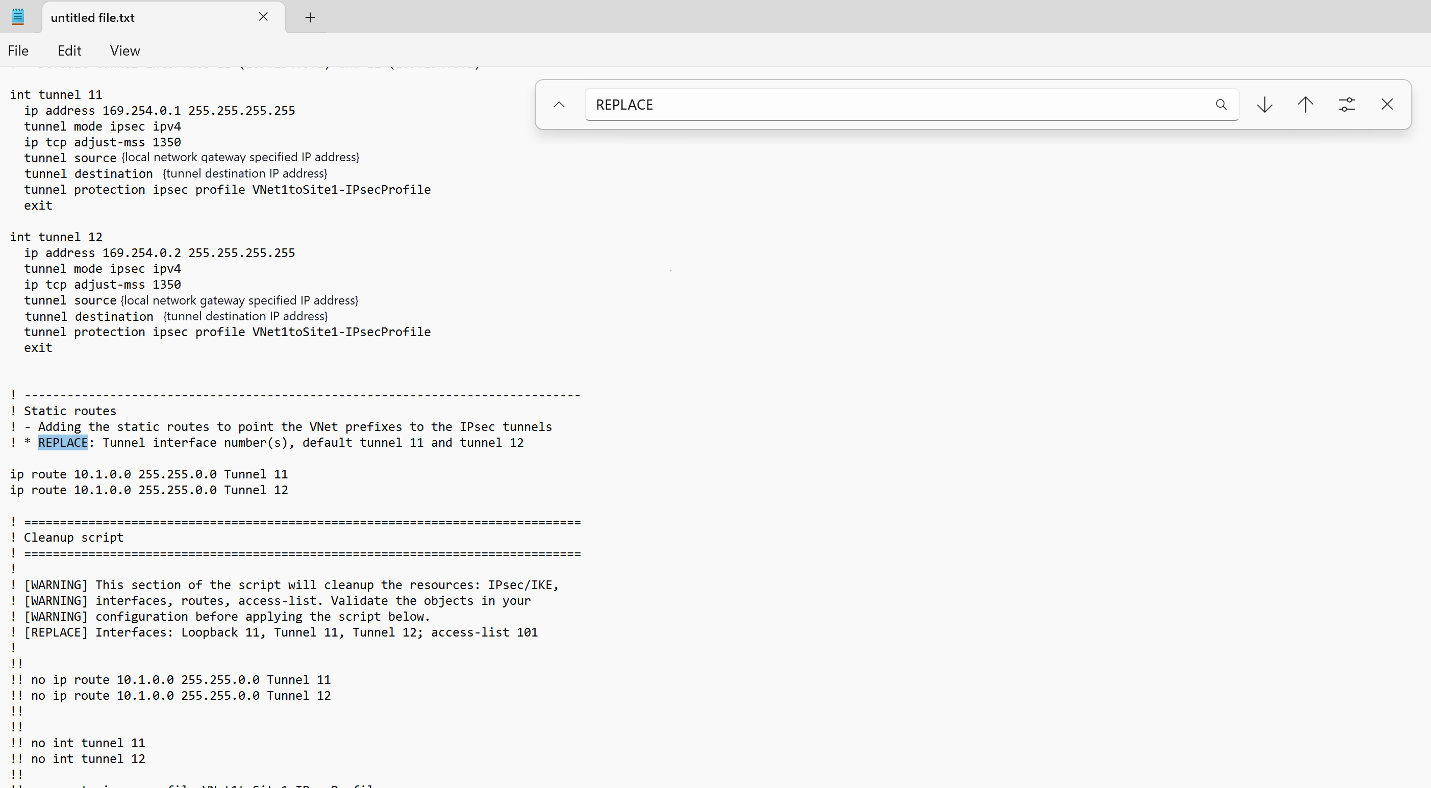 使用文本编辑器打开配置脚本并搜索关键字“REPLACE”,以标识并检查可能需要替换的参数,然后将脚本应用到 VPN 设备。