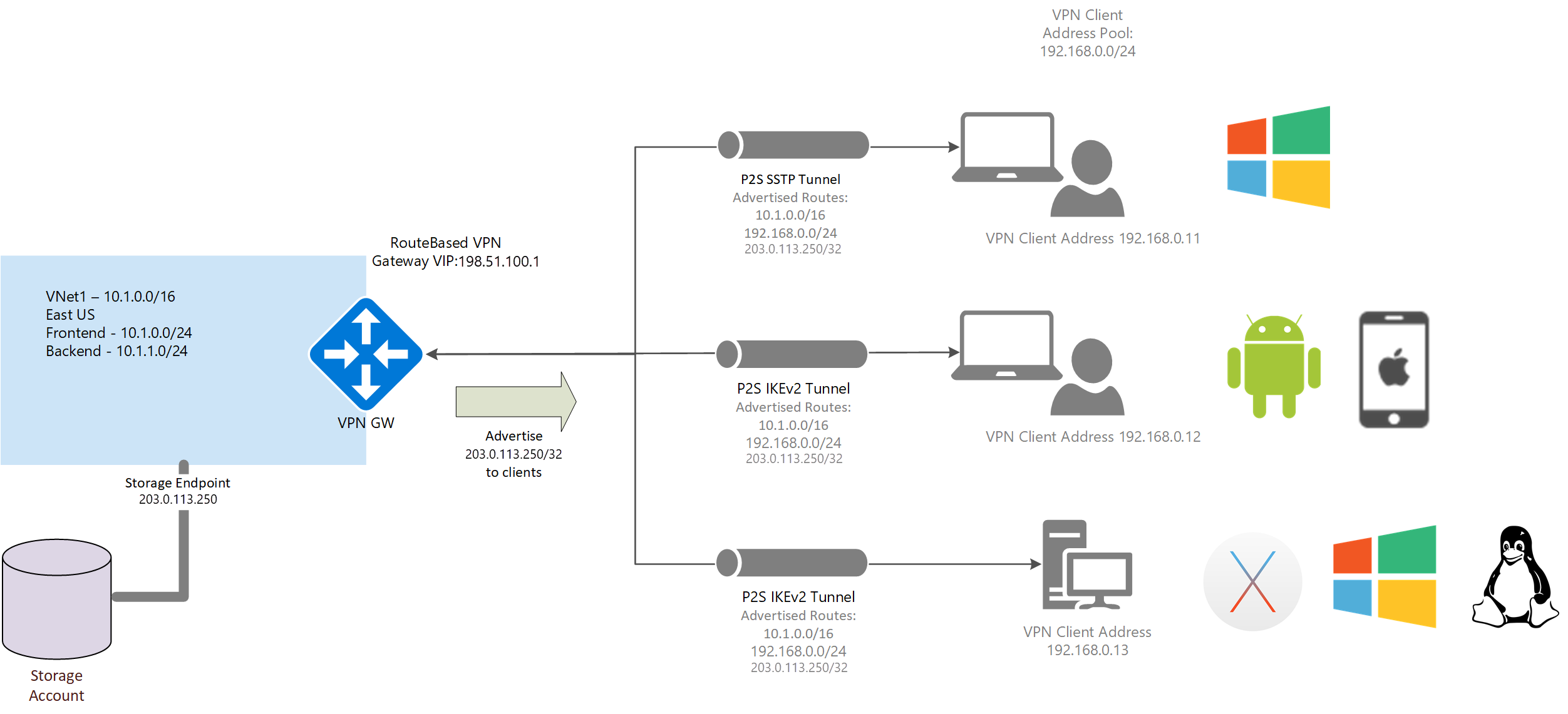 你可能想要向所有点到站点 VPN 客户端播发自定义路由。 例如,当你在 VNet 中启用了存储终结点并希望远程用户能够通过 VPN 连接访问这些存储帐户时。 可以将存储终结点的 IP 地址公布给所有远程用户,以便到存储帐户的流量通过虚拟专用网络 (VPN) 隧道而非公共 Internet。 还可以使用自定义路由为 VPN 客户端配置强制隧道。