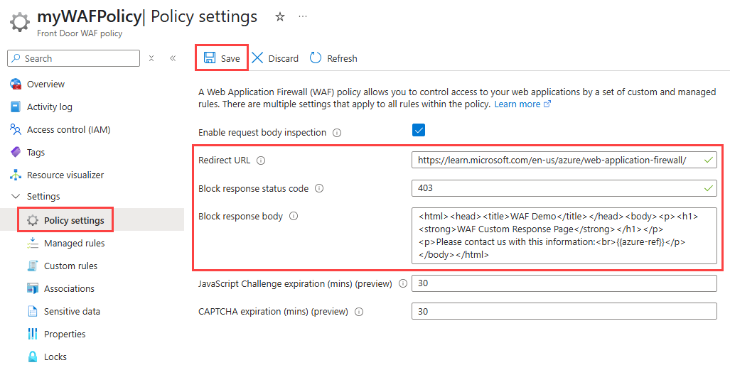 若要自定义响应状态代码和正文,请使用 az network front-door waf-policy update 命令。