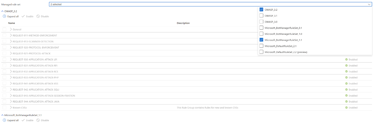 可以将机器人保护规则集与任何带有应用程序网关 WAF v2 SKU 的 OWASP 规则集一起使用。 在任意给定时间,只能使用一个 OWASP 规则集。 机器人防护规则集包含另一个规则,该规则显示在其自己的规则集中。 该规则名为 Microsoft_BotManagerRuleSet_1.1,其启用或禁用方式与其他 OWASP 规则一样。