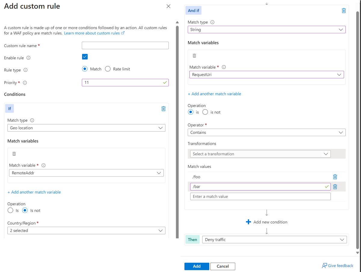 若要创建一个地理匹配自定义规则,该规则阻止来自除美国和加拿大以外的所有国家/地区到指定 URI 的流量,请参阅门户、PowerShell 和 Bicep 示例。