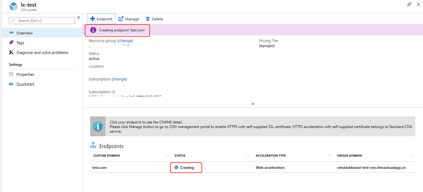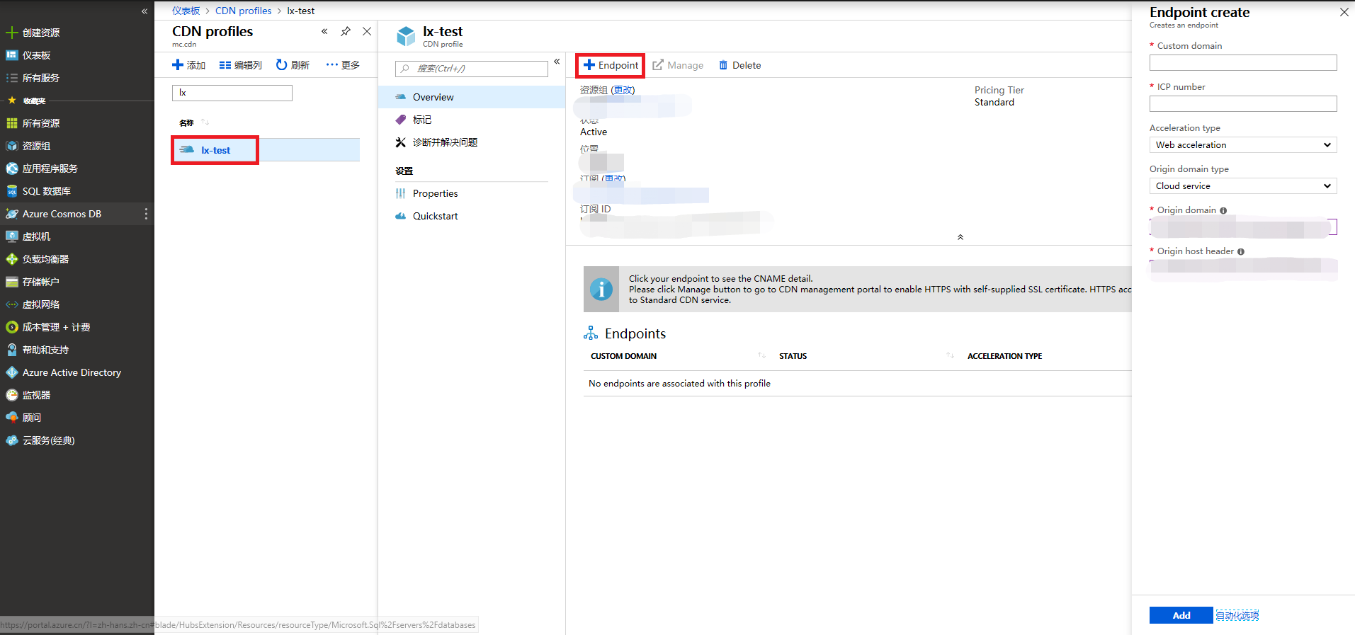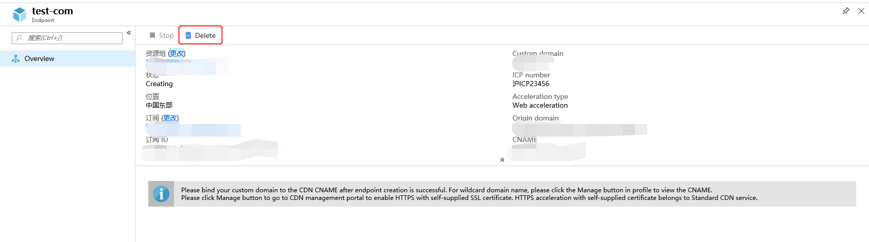 为终结点创建的配置不是立即可用的。 必须对其进行审核,检查 ICP 自定义域名是否与 ICP 号匹配。 有关详细信息,请参阅使用 Azure 内容分发网络中的“步骤 2:创建新的内容分发网络终结点”的后半部分。