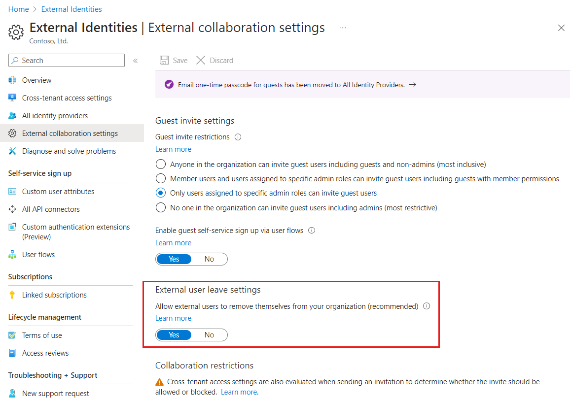 管理员可以使用“外部用户离开设置”来控制外部用户是否可以将自己从其组织中移除。 如果不允许外部用户将自己从你的组织中移除,外部用户将需要联系管理员或隐私联系人才能被移除。