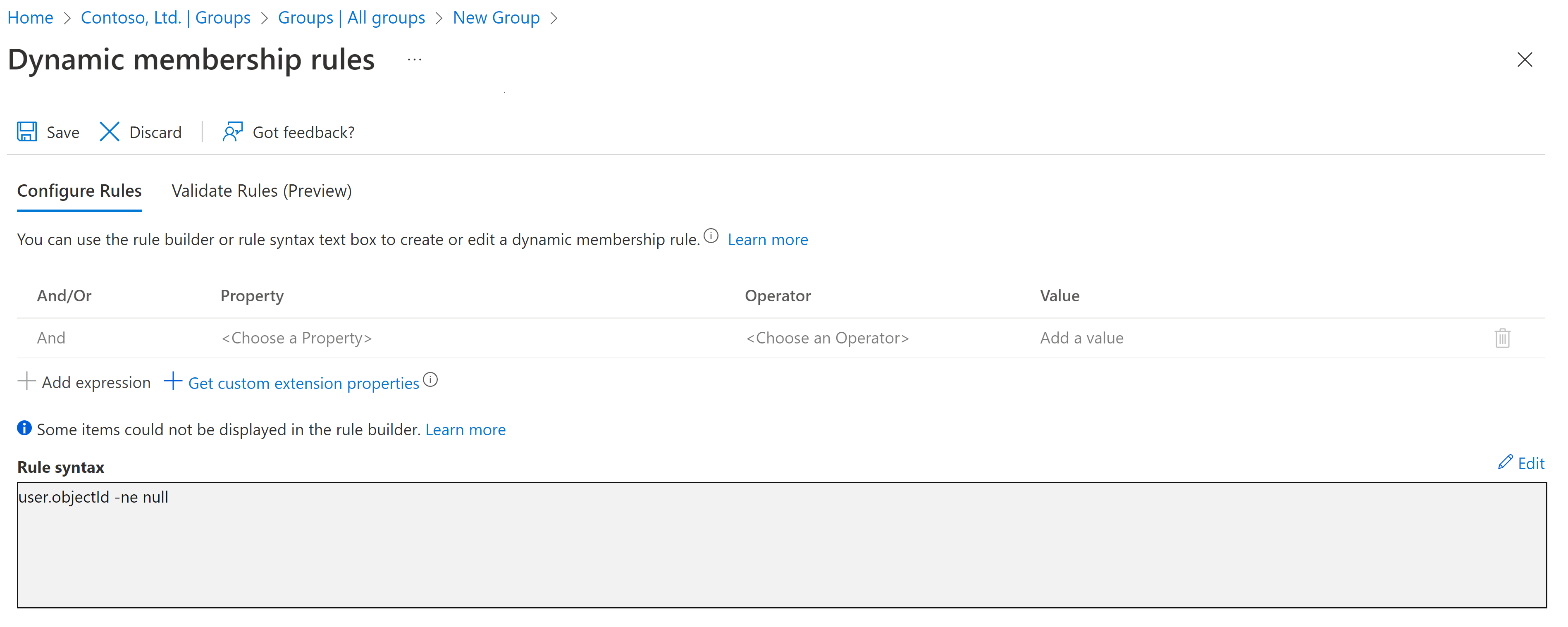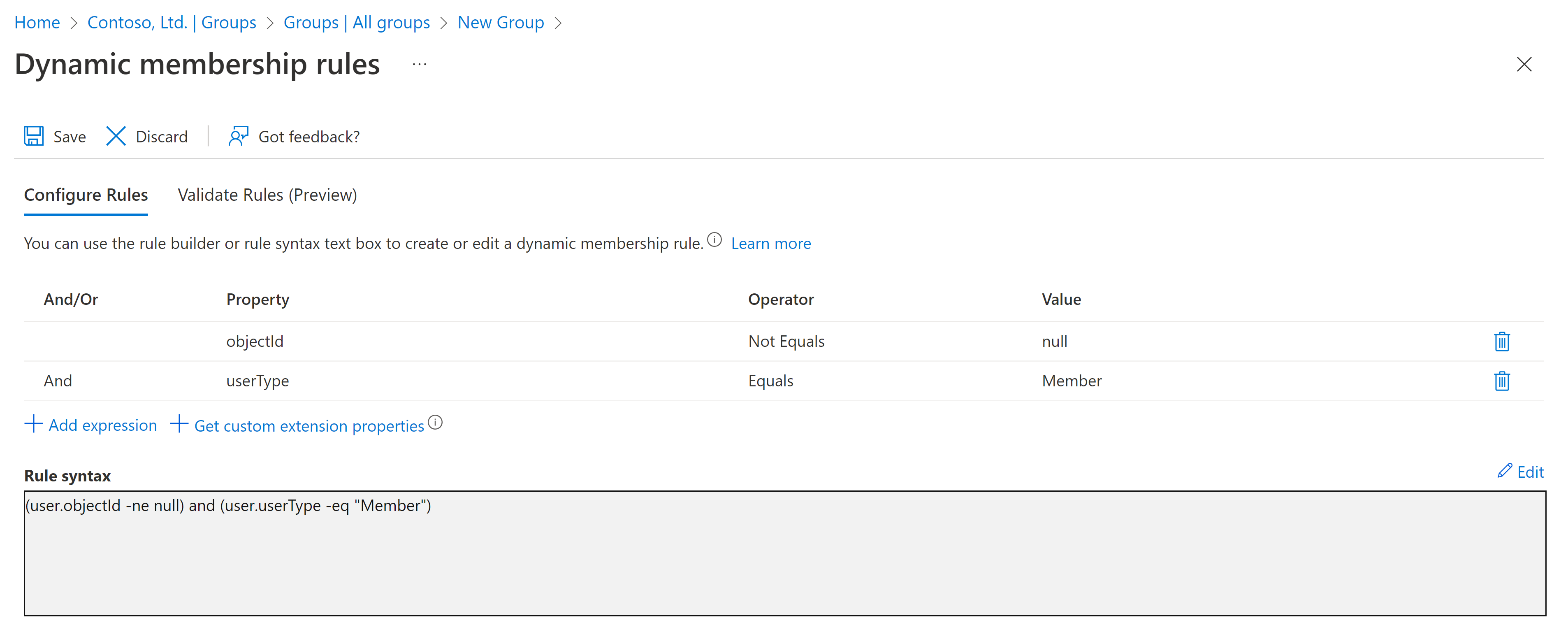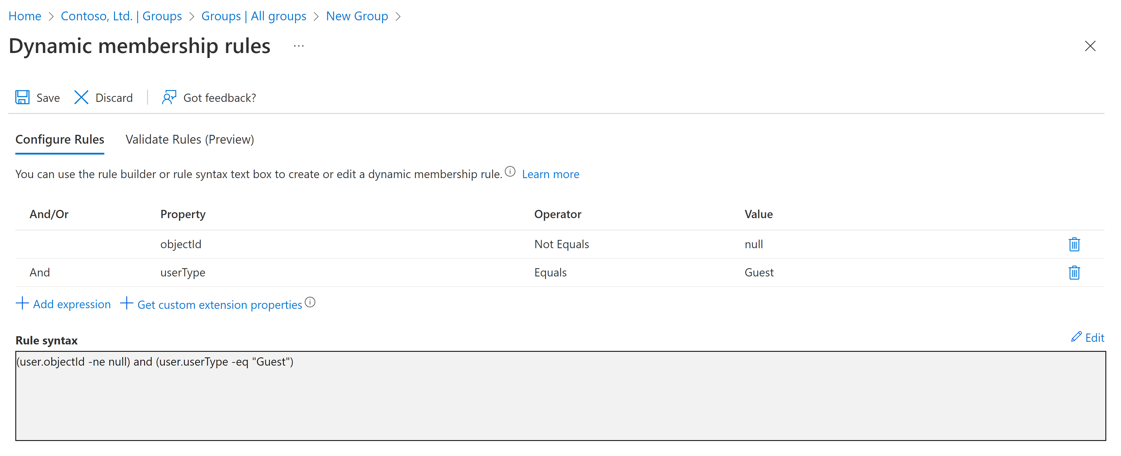 如果希望组排除来宾用户,只包含租户的成员,请按照上述要求创建动态组,但在“规则语法” 框中,请输入以下表达式: