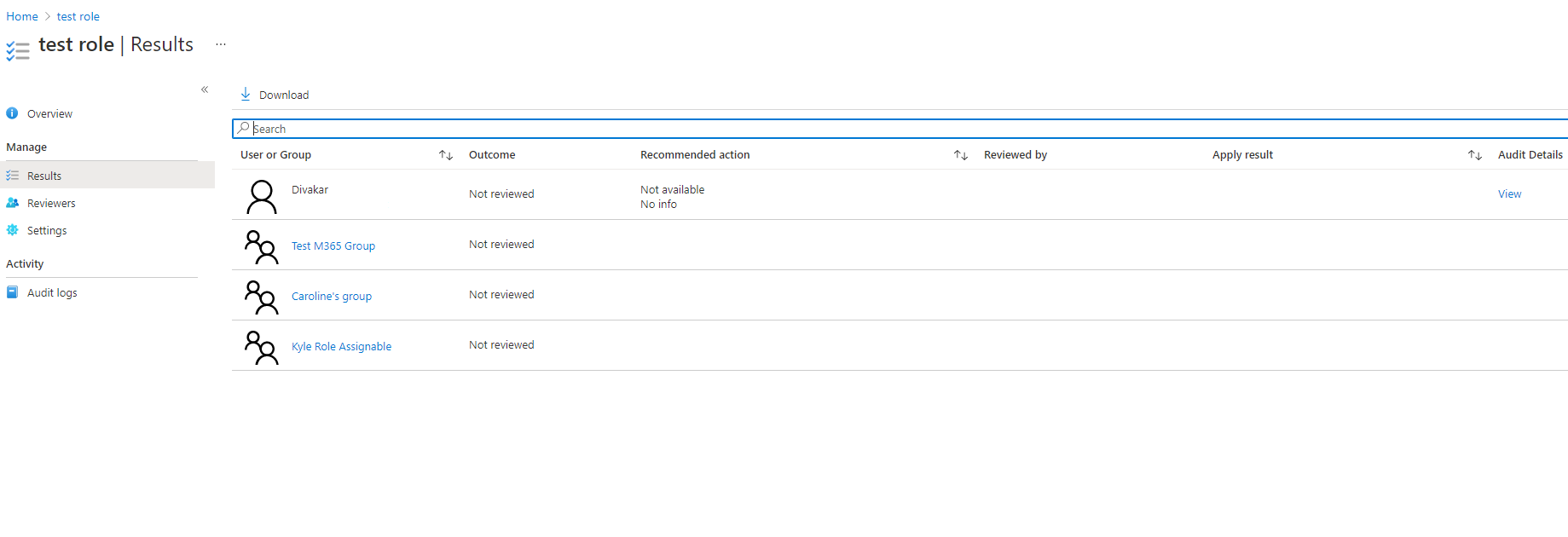 如果将组分配给 Azure 资源角色,Azure 资源角色的审阅者将看到嵌套组中用户的扩展列表。 如果审阅者拒绝嵌套组的成员,则该拒绝结果不会被成功应用,因为不会从嵌套组中删除用户。