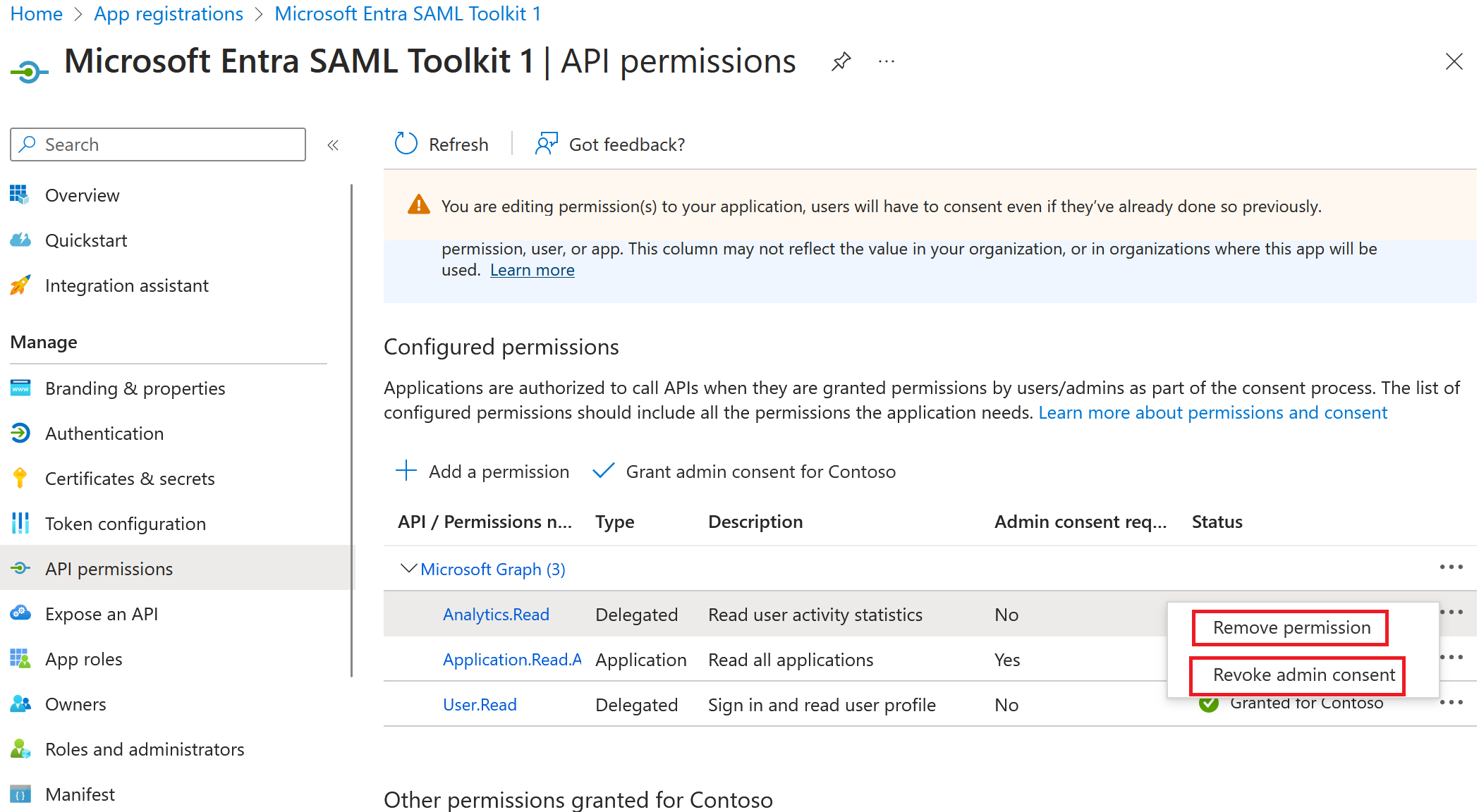 从应用注册中移除权限不会自动撤销已授予应用的权限。 需要手动撤销权限。 有关详细信息,请参阅本文中撤销对企业应用程序已移除权限的同意部分。