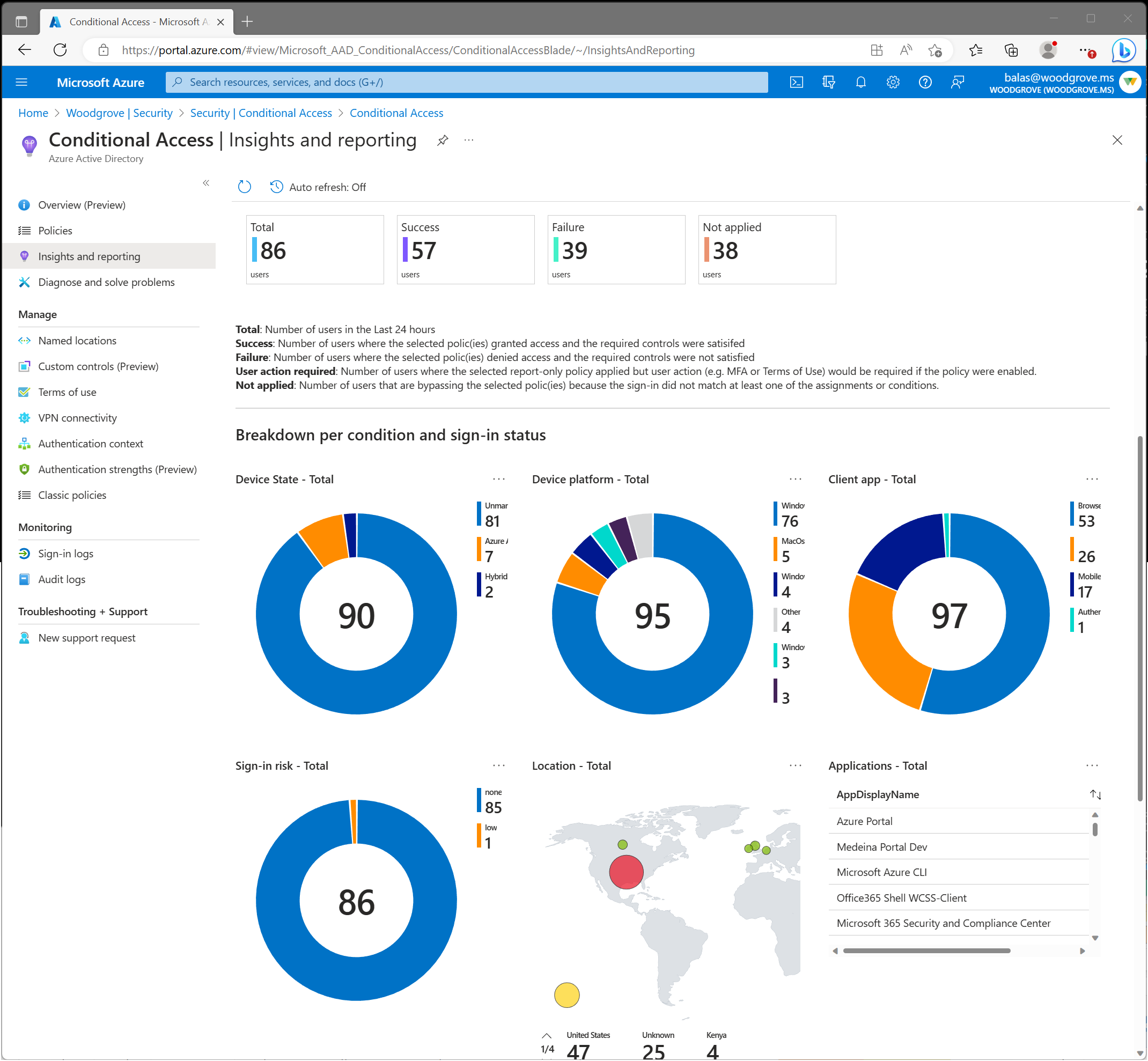 查看每个条件对应的用户或登录明细。 可以通过选择工作簿顶部的某个摘要数据块来筛选特定结果的登录活动(例如成功或失败)。 可以查看每个条件访问条件对应的登录明细:设备状态、设备平台、客户端应用、位置、应用和登录风险。