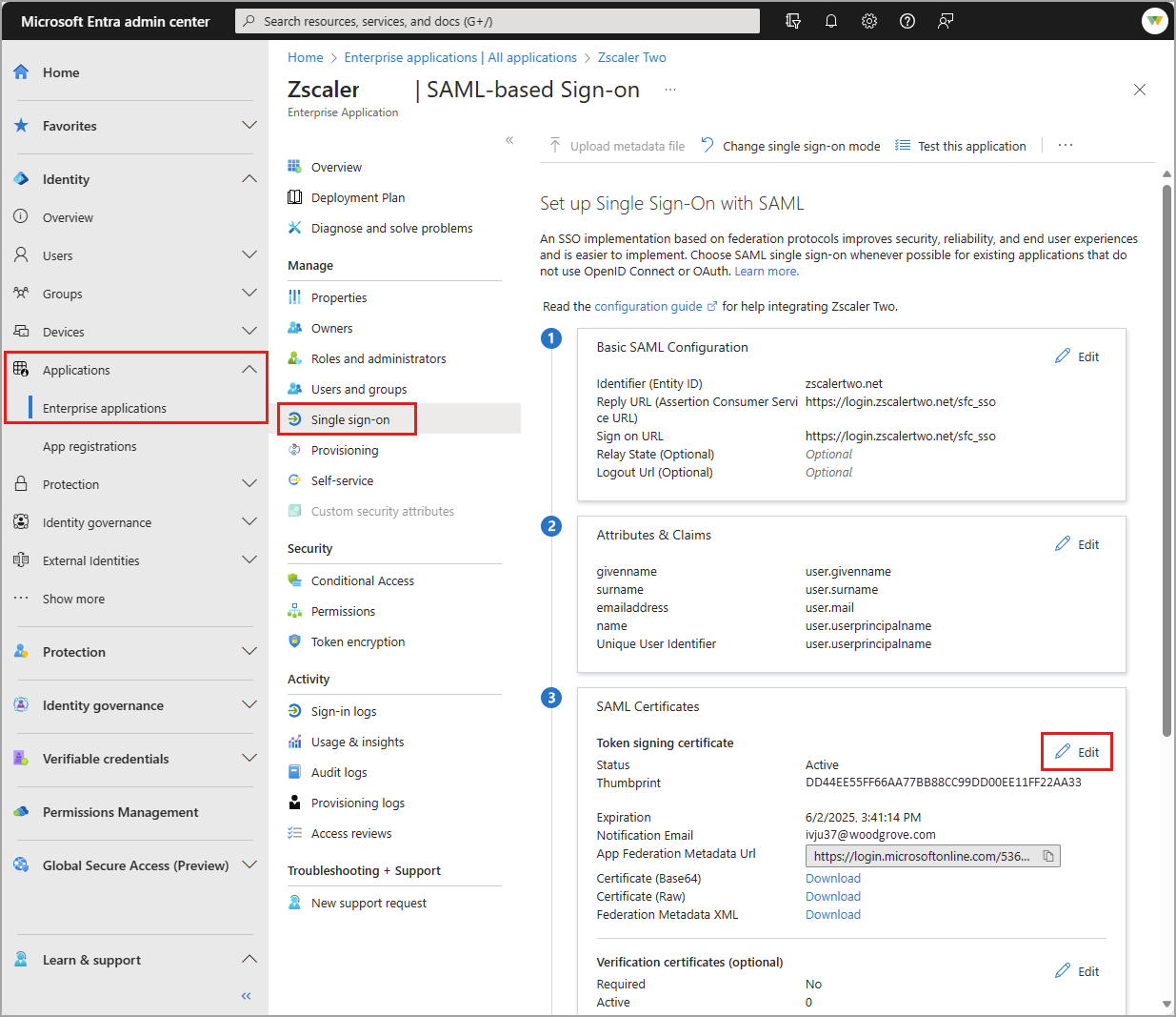 编辑“SAML 签名证书”部分,并按照提示添加新证书。