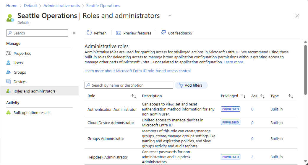 从左侧导航菜单中选择 角色和管理员,以查看可在管理单元上分配的所有角色的列表。