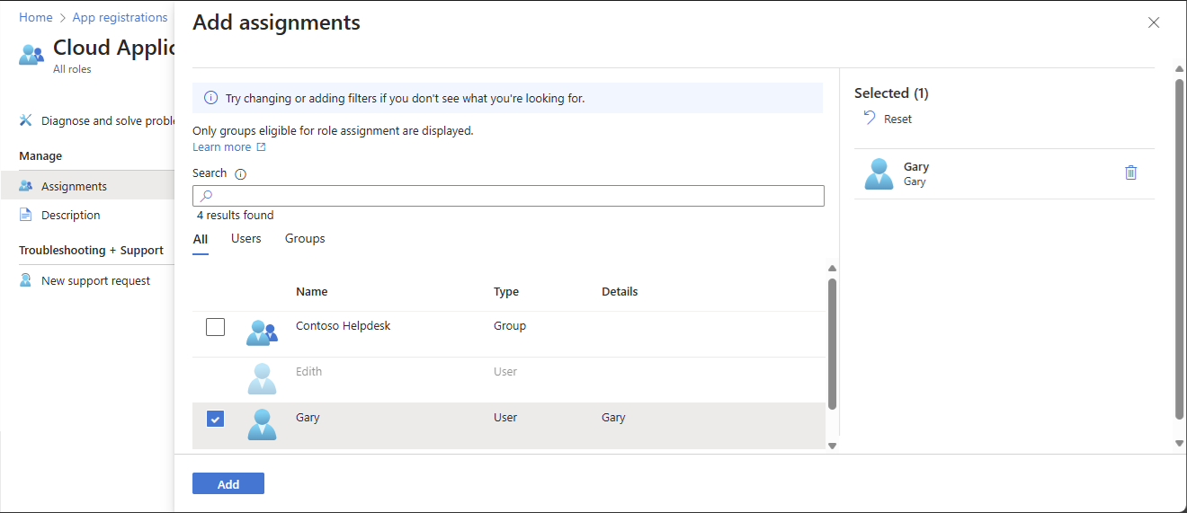 管理单元。 选择“添加分配”,然后选择要向其分配此角色的用户或组。