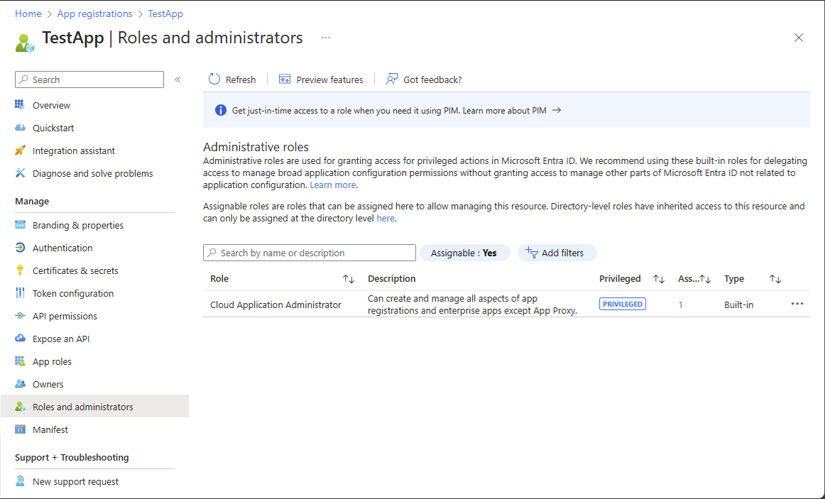 从左侧导航菜单中选择 角色和管理员,以查看可通过应用注册分配的所有角色的列表。