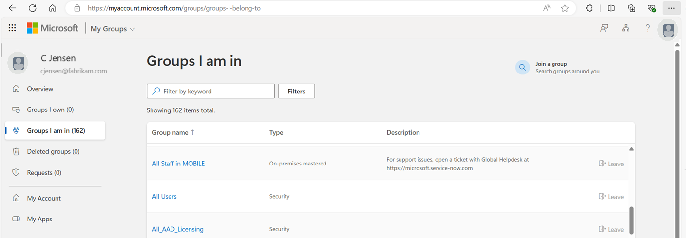 Microsoft Entra ID 提供自助服务组管理功能,使用户能够创建和管理自己的安全组或 Microsoft 365 组。 组的所有者可以批准或拒绝成员身份请求,并委托对组成员身份的控制。 自助服务组管理功能不可用于启用了邮件的安全组或通讯组列表。