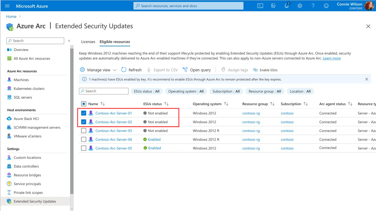 可以选择一个或多个已启用 Arc 的服务器以链接到扩展安全更新许可证。 将服务器链接到已激活的 ESU 许可证后,服务器有资格接收 Windows Server 2012 和 2012 R2 ESU。