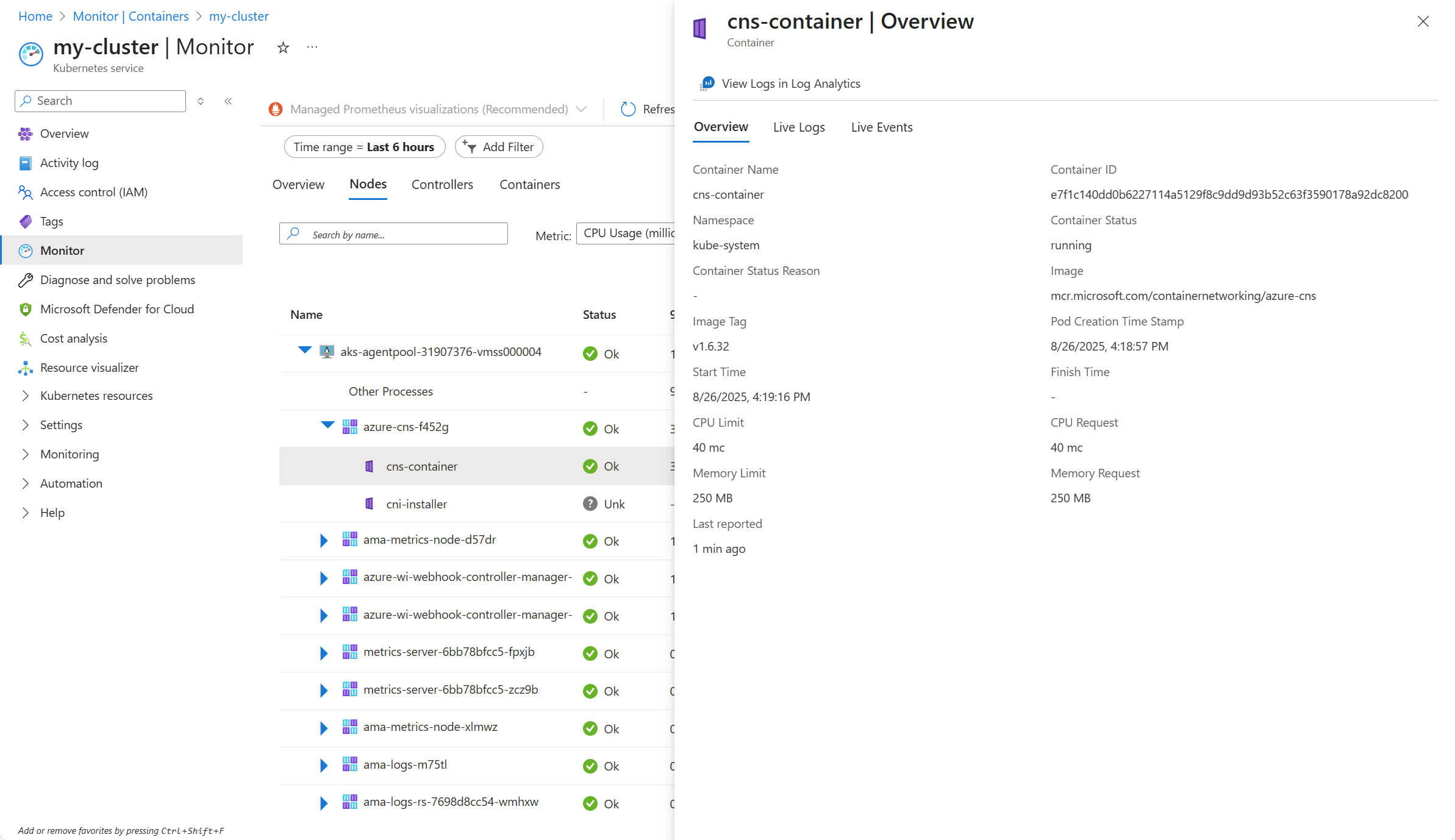 如果具有所需的选项,请单击“ 配置”。 这会将 Azure Monitor 代理 部署到群集并开始收集数据。 几分钟后, “监视器 ”屏幕上的磁贴将开始填充数据。 选择 节点、 控制器和 容器 ,并注意到这些选项卡填充了群集中的资源。 展开对象以检查不同的资源类型。 单击一个可查看其详细信息。