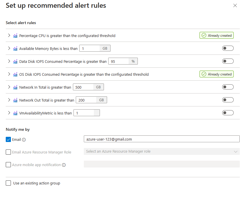 将显示建议的警报规则列表。 可以选择要创建的规则。 还可以更改建议的阈值。 确保已启用电子邮件,并提供一个电子邮件地址以便在任何警报触发时接收通知。 将使用此地址创建 一个操作组 。 如果您已经有想要使用的操作组,可以选择指定它。