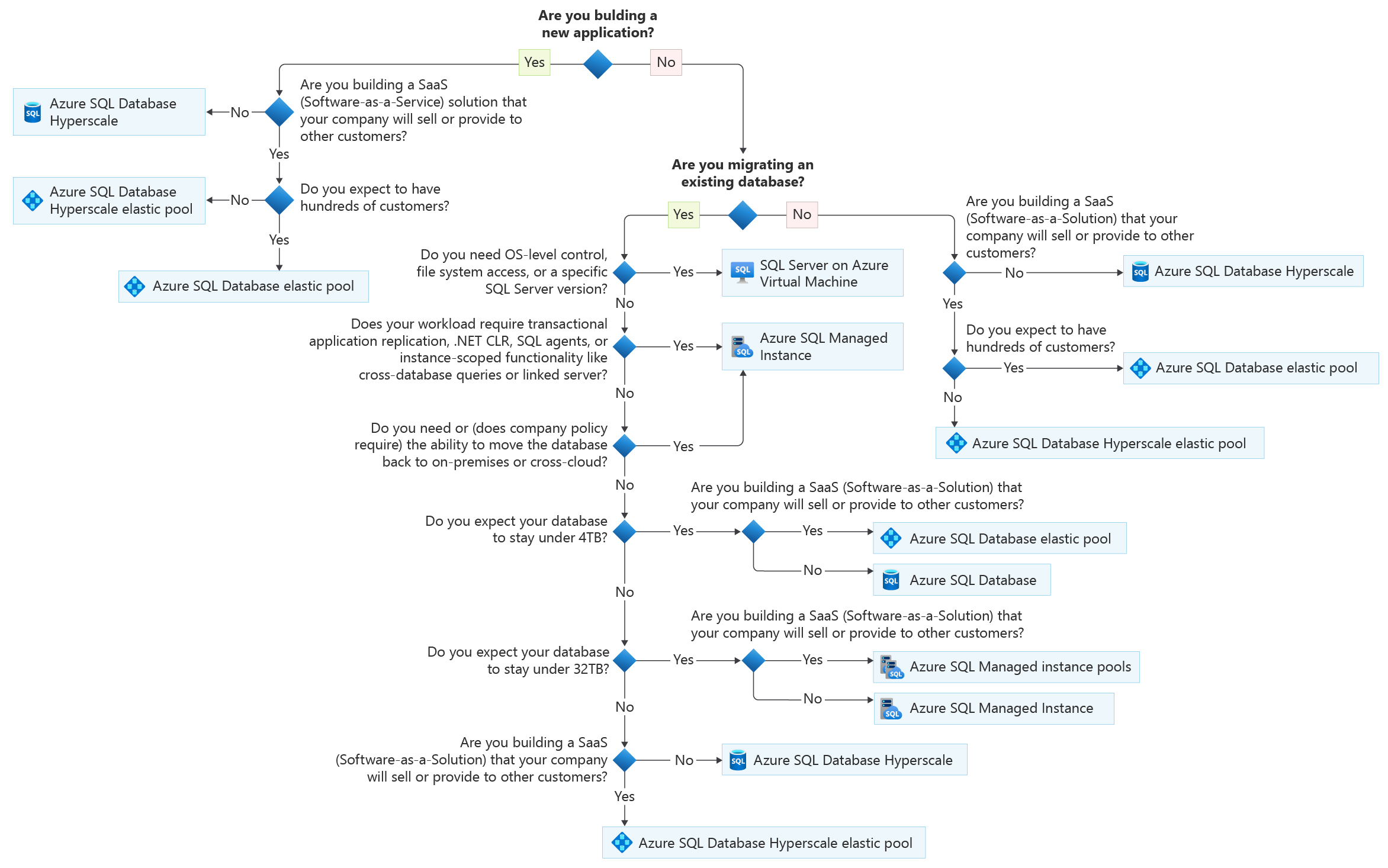 是的: 选择 Azure SQL 数据库。 此外,如果考虑为数百个客户或更多客户配置新的 SaaS(软件即服务)解决方案,请将 Azure SQL 数据库配置为弹性池,以便为许多不同的客户数据库提供经济高效且可预测的资源成本。 可以考虑一种数据库体系结构,将每个客户分配到使用弹性池的独立数据库中,期望每个数据库保持在 4 TB 以下。
