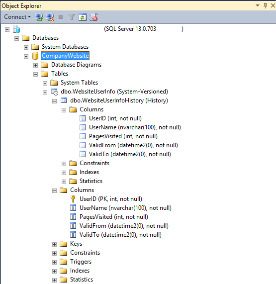 让我们讨论另一种情况,即 WebsiteUserInfo 表已存在,但并未设计为保留更改历史记录。 在这种情况下,只需将现有表扩展为临时表即可,如以下示例中所示: