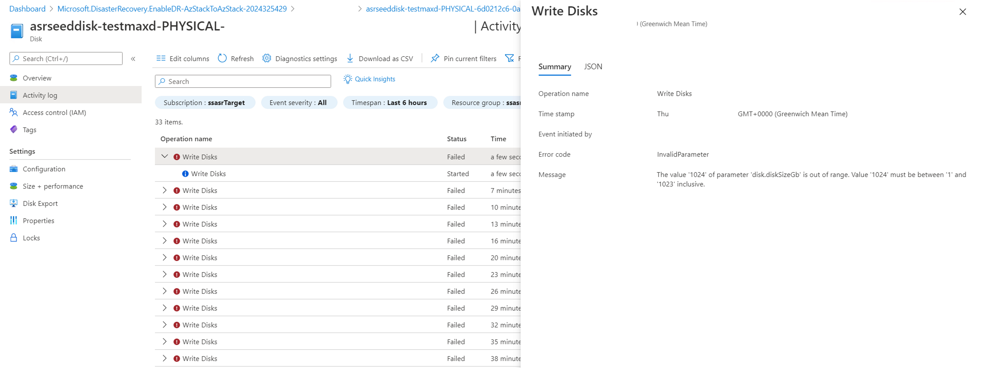 (在目标订阅中)为此磁盘创建的种子磁盘大小仍为 1 GB,而“活动日志”会显示一些“写入磁盘”故障,并显示错误消息:“参数‘disk.diskSizeGb’的值‘1024’超出范围。值‘1024’必须在‘1’和‘1023’之间(含‘1’和‘1023’)。