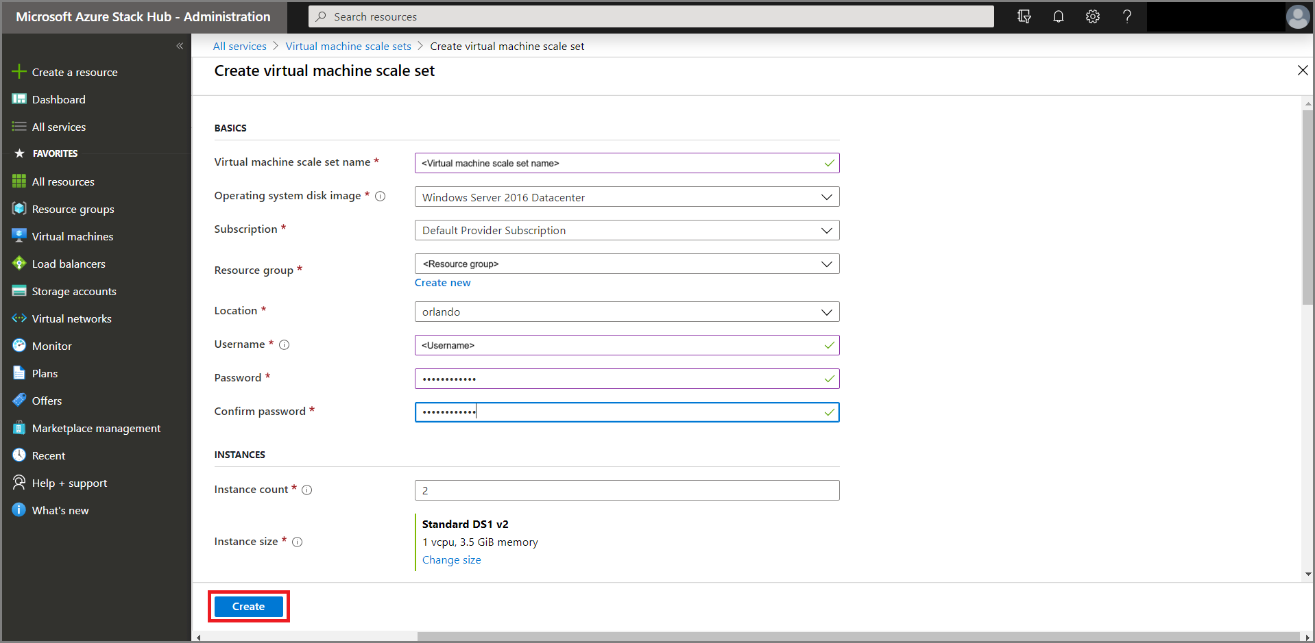 - 操作系统映像: 在创建虚拟机规模集之前,必须从 Azure Stack Hub 市场下载 VM 映像,以便在规模集中使用。 必须已存在映像,然后用户才能创建新的规模集。