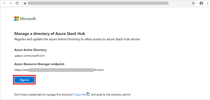 Mary 收到了电子邮件,其中包含用于注册目录的链接。 她在浏览器中打开该链接,确认 Microsoft Entra ID 和 Azure Stack Hub 系统的 Azure 资源管理器终结点。